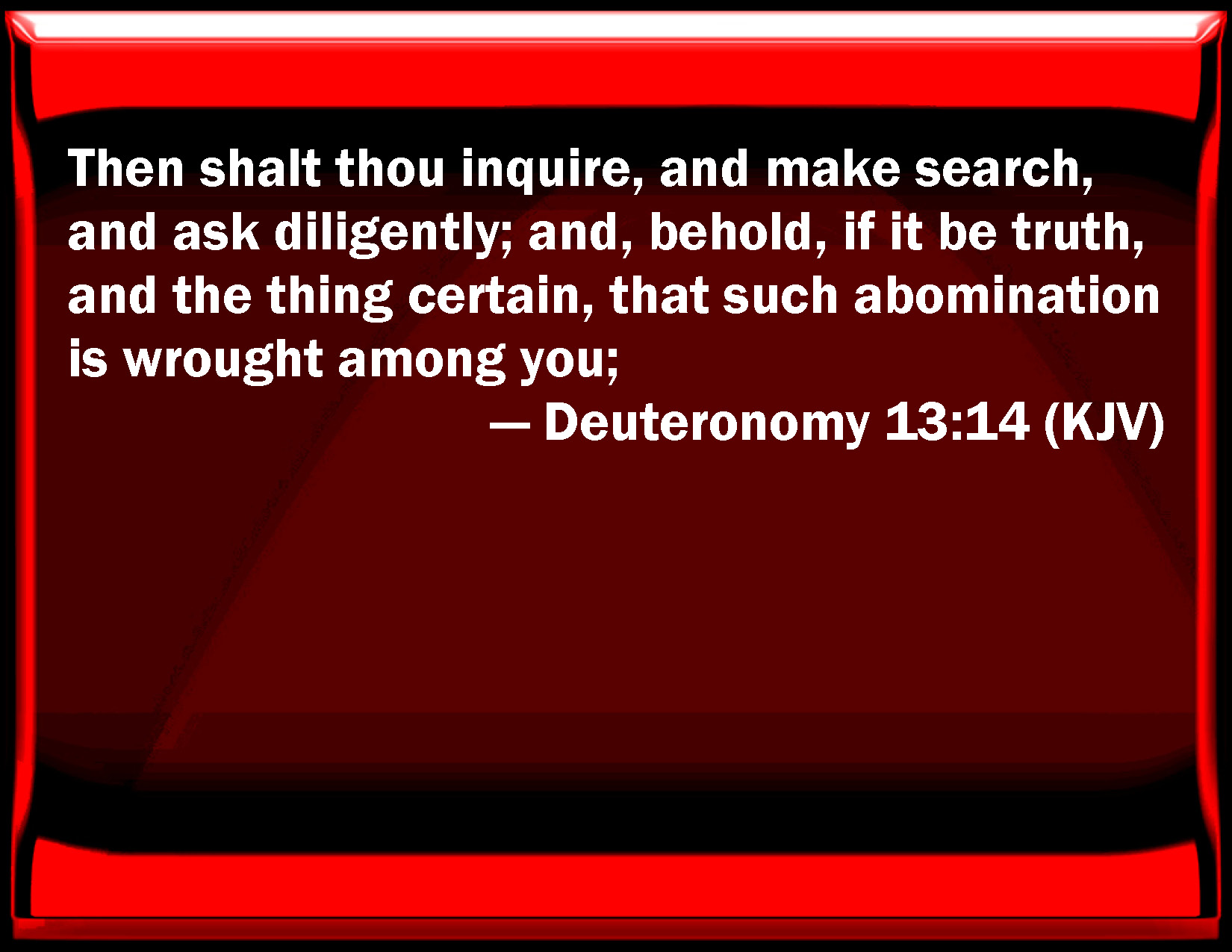 Bible Verse Slide Deuteronomy 13:14 Then shall you inquire, and make search, and ask diligently; and, behold, if it be truth, and the thing certain, that such abomination is worked among you; KJV: Then shalt thou inquire, and make search, and ask diligently; and, behold, if it be truth, and the thing certain, that such abomination is wrought among you; DRB: Inquire carefully and diligently, the truth of the thing by looking well into it, and if thou find that which is said to be certain, and that this abomination hath been really committed, DBT: then shalt thou inquire, and make search, and ask diligently; and if it be truth, and the thing be certain, that this abomination hath happened in the midst of thee, ERV: then shalt thou inquire, and make search, and ask diligently; and, behold, if it be truth, and the thing certain, that such abomination is wrought in the midst of thee; WBT: Then shalt thou inquire, and make search, and ask diligently; and behold, if it is truth, and the thing certain, that such abomination is wrought among you; WEB: then you shall inquire, and make search, and ask diligently; and, behold, if it be truth, and the thing certain, that such abomination is done in the midst of you, YLT: and thou hast enquired, and searched, and asked diligently, and lo, truth; the thing is established; this abomination hath been done in thy midst:Links Deuteronomy 13:14 NIV • Deuteronomy 13:14 NLT • Deuteronomy 13:14 ESV • Deuteronomy 13:14 NASB • Deuteronomy 13:14 KJV • Deuteronomy 13:14 Interlinear • Deuteronomy 13:14 Commentaries • Deuteronomy 13:14 Parallel Texts • Deuteronomy 13:14 Bible Apps • Deuteronomy 13:14 Parallel • Bible Hub |