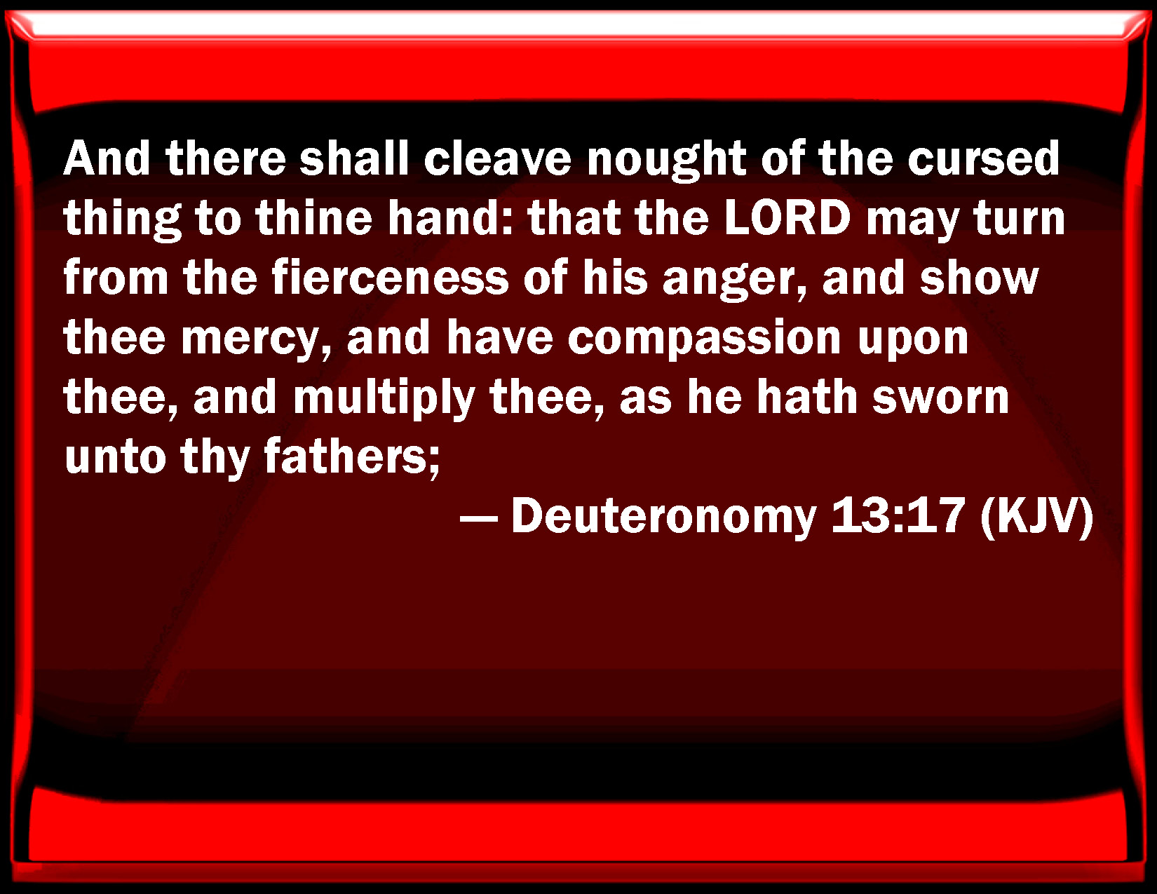 Bible Verse Slide Deuteronomy 13:17 And there shall stick nothing of the cursed thing to your hand: that the LORD may turn from the fierceness of his anger, and show you mercy, and have compassion on you, and multiply you, as he has sworn to your fathers; KJV: And there shall cleave nought of the cursed thing to thine hand: that the LORD may turn from the fierceness of his anger, and shew thee mercy, and have compassion upon thee, and multiply thee, as he hath sworn unto thy fathers; DRB: And there shall nothing of that anathema stick to thy hand: that the Lord may turn from the wrath of his fury, and may have mercy on thee, and multiply thee as he swore to thy fathers, DBT: And thou shalt not let anything cleave to thy hand of the devoted thing; that Jehovah may turn from the fierceness of his anger, and shew thee mercy, and have compassion upon thee, and multiply thee, as he hath sworn unto thy fathers; ERV: And there shall cleave nought of the devoted thing to thine hand: that the LORD may turn from the fierceness of his anger, and shew thee mercy, and have compassion upon thee, and multiply thee, as he hath sworn unto thy fathers; WBT: And there shall cleave naught of the cursed thing to thy hand: that the LORD may turn from the fierceness of his anger, and show thee mercy, and have compassion upon thee, and multiply thee, as he hath sworn to thy fathers; WEB: Nothing of the devoted thing shall cling to your hand; that Yahweh may turn from the fierceness of his anger, and show you mercy, and have compassion on you, and multiply you, as he has sworn to your fathers; YLT: and there doth not cleave to thy hand any of the devoted thing, so that Jehovah doth turn back from the fierceness of His anger, and hath given to thee mercies, and loved thee, and multiplied thee, as He hath sworn to thy fathers,Links Deuteronomy 13:17 NIV • Deuteronomy 13:17 NLT • Deuteronomy 13:17 ESV • Deuteronomy 13:17 NASB • Deuteronomy 13:17 KJV • Deuteronomy 13:17 Interlinear • Deuteronomy 13:17 Commentaries • Deuteronomy 13:17 Parallel Texts • Deuteronomy 13:17 Bible Apps • Deuteronomy 13:17 Parallel • Bible Hub |