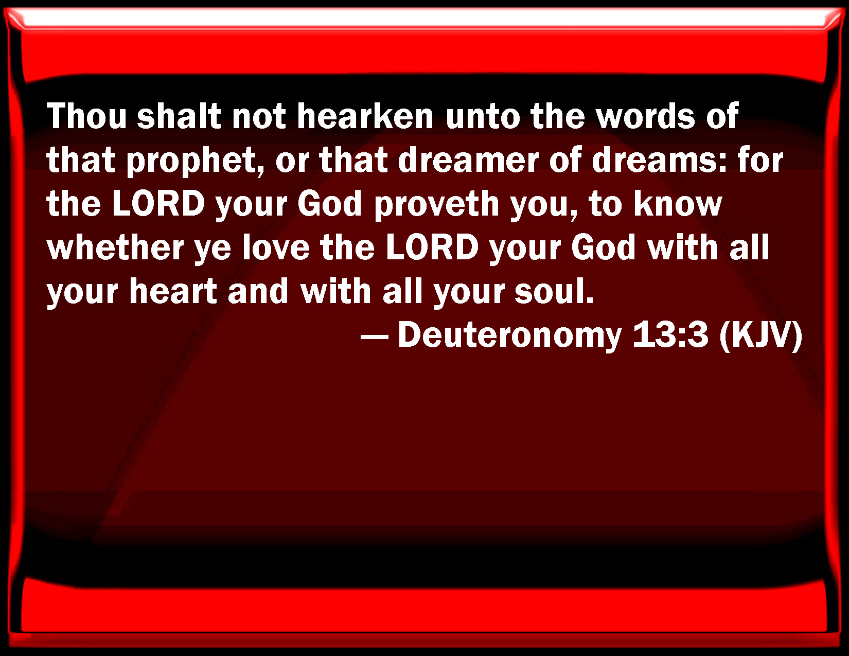 Bible Verse Slide Deuteronomy 13:3 You shall not listen to the words of that prophet, or that dreamer of dreams: for the LORD your God proves you, to know whether you love the LORD your God with all your heart and with all your soul. KJV: Thou shalt not hearken unto the words of that prophet, or that dreamer of dreams: for the LORD your God proveth you, to know whether ye love the LORD your God with all your heart and with all your soul. DRB: Thou shalt not hear the words of that prophet or dreamer: for the Lord your God trieth you, that it may appear whether you love him with all your heart, and with all your soul, or not. DBT: thou shalt not hearken unto the words of that prophet, or that dreamer of dreams; for Jehovah your God proveth you, to know whether ye love Jehovah your God with all your heart and with all your soul. ERV: thou shalt not hearken unto the words of that prophet, or unto that dreamer of dreams: for the LORD your God proveth you, to know whether ye love the LORD your God with all your heart and with all your soul. WBT: Thou shalt not hearken to the words of that prophet, or that dreamer of dreams: for the LORD your God proveth you, to know whether ye love the LORD your God with all your heart and with all your soul. WEB: you shall not listen to the words of that prophet, or to that dreamer of dreams: for Yahweh your God proves you, to know whether you love Yahweh your God with all your heart and with all your soul. YLT: thou dost not hearken unto the words of that prophet, or unto that dreamer of the dream, for Jehovah your God is trying you, to know whether ye are loving Jehovah your God with all your heart, and with all your soul;Links Deuteronomy 13:3 NIV • Deuteronomy 13:3 NLT • Deuteronomy 13:3 ESV • Deuteronomy 13:3 NASB • Deuteronomy 13:3 KJV • Deuteronomy 13:3 Interlinear • Deuteronomy 13:3 Commentaries • Deuteronomy 13:3 Parallel Texts • Deuteronomy 13:3 Bible Apps • Deuteronomy 13:3 Parallel • Bible Hub |