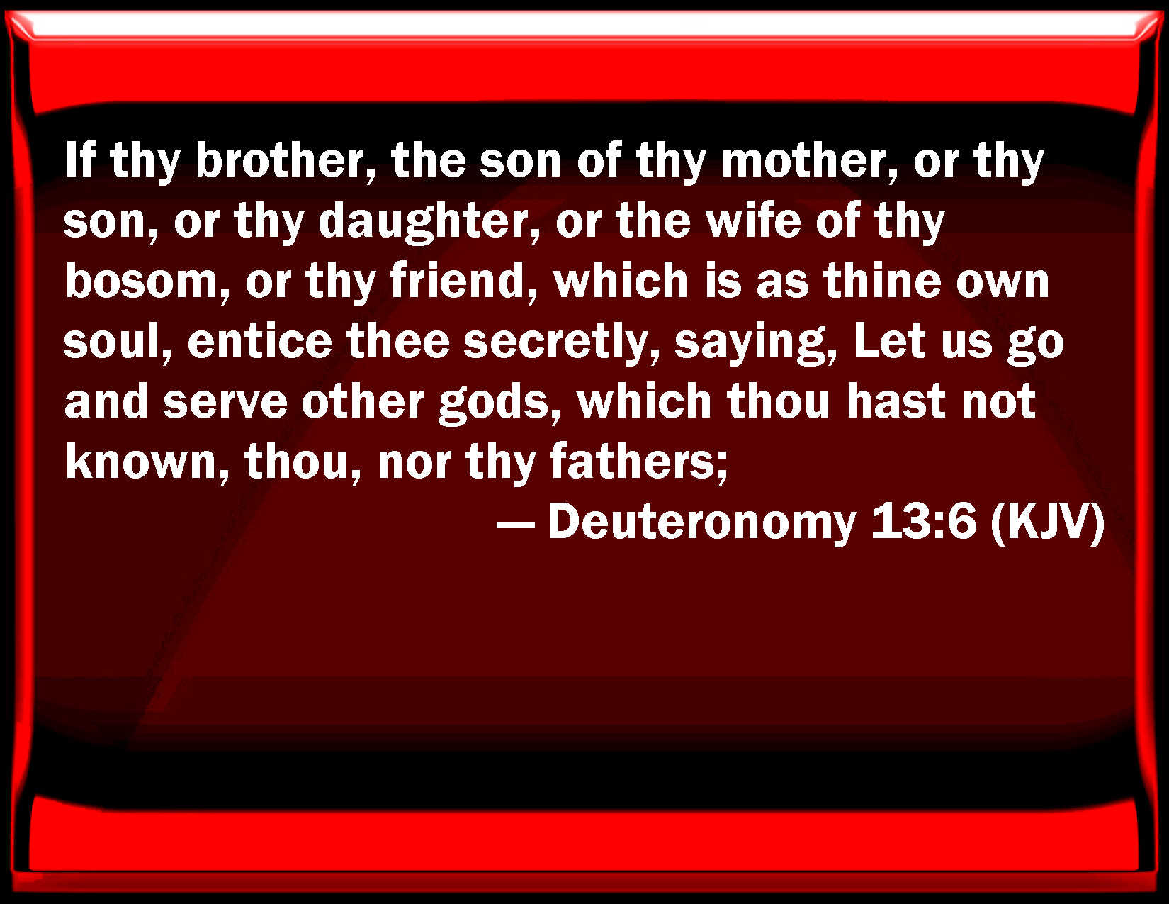 Bible Verse Slide Deuteronomy 13:6 If your brother, the son of your mother, or your son, or your daughter, or the wife of your bosom, or your friend, which is as your own soul, entice you secretly, saying, Let us go and serve other gods, which you have not known, you, nor your fathers; KJV: If thy brother, the son of thy mother, or thy son, or thy daughter, or the wife of thy bosom, or thy friend, which is as thine own soul, entice thee secretly, saying, Let us go and serve other gods, which thou hast not known, thou, nor thy fathers; DRB: If thy brother the son of thy mother, or thy son, or daughter, or thy wife that is in thy bosom, or thy friend, whom thou lovest as thy own soul, would persuade thee secretly, saying: Let us go, and serve strange gods, which thou knowest not, nor thy fathers, DBT: If thy brother, the son of thy mother, or thy son, or thy daughter, or the wife of thy bosom, or thy friend, who is to thee as thy soul, entice thee secretly, saying, Let us go and serve other gods (whom thou hast not known, thou, nor thy fathers; ERV: If thy brother, the son of thy mother, or thy son, or thy daughter, or the wife of thy bosom, or thy friend, which is as thine own soul, entice thee secretly, saying, Let us go and serve other gods, which thou hast not known, thou, nor thy fathers; WBT: If thy brother, the son of thy mother, or thy son, or thy daughter, or the wife of thy bosom, or thy friend, who is as thy own soul, shall entice thee secretly, saying, Let us go and serve other gods, which thou hast not known, thou, nor thy fathers; WEB: If your brother, the son of your mother, or your son, or your daughter, or the wife of your bosom, or your friend, who is as your own soul, entice you secretly, saying, "Let us go and serve other gods," which you have not known, you, nor your fathers; YLT: When thy brother — son of thy mother, or thy son, or thy daughter, or the wife of thy bosom, or thy friend who is as thine own soul — doth move thee, in secret, saying, Let us go and serve other gods — (which thou hast not known, thou and thy fathers,Links Deuteronomy 13:6 NIV • Deuteronomy 13:6 NLT • Deuteronomy 13:6 ESV • Deuteronomy 13:6 NASB • Deuteronomy 13:6 KJV • Deuteronomy 13:6 Interlinear • Deuteronomy 13:6 Commentaries • Deuteronomy 13:6 Parallel Texts • Deuteronomy 13:6 Bible Apps • Deuteronomy 13:6 Parallel • Bible Hub |