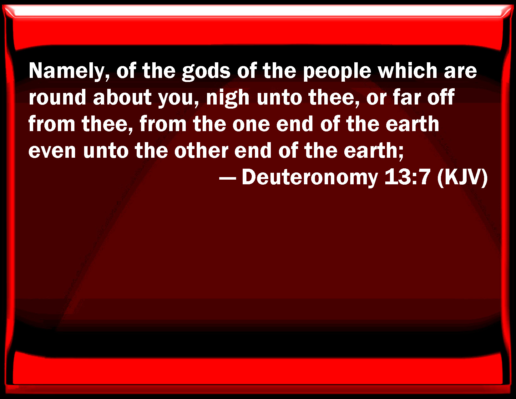 Bible Verse Slide Deuteronomy 13:7 Namely, of the gods of the people which are round about you, near to you, or far off from you, from the one end of the earth even to the other end of the earth; KJV: Namely, of the gods of the people which are round about you, nigh unto thee, or far off from thee, from the one end of the earth even unto the other end of the earth; DRB: Of all the nations round about, that are near or afar off, from one end of the earth to the other, DBT: of the gods of the peoples which are round about you, near unto thee, or far from thee, from one end of the earth even unto the other end of the earth), ERV: of the gods of the peoples which are round about you, nigh unto thee, or far off from thee, from the one end of the earth even unto the other end of the earth; WBT: Namely, of the gods of the people who are around you, nigh to thee, or far off from thee, from one end of the earth even to the other end of the earth; WEB: of the gods of the peoples who are around you, near to you, or far off from you, from the one end of the earth even to the other end of the earth; YLT: of the gods of the peoples who are round about you, who are near unto thee, or who are far off from thee, from the end of the earth even unto the end of the earth) — Links Deuteronomy 13:7 NIV • Deuteronomy 13:7 NLT • Deuteronomy 13:7 ESV • Deuteronomy 13:7 NASB • Deuteronomy 13:7 KJV • Deuteronomy 13:7 Interlinear • Deuteronomy 13:7 Commentaries • Deuteronomy 13:7 Parallel Texts • Deuteronomy 13:7 Bible Apps • Deuteronomy 13:7 Parallel • Bible Hub |