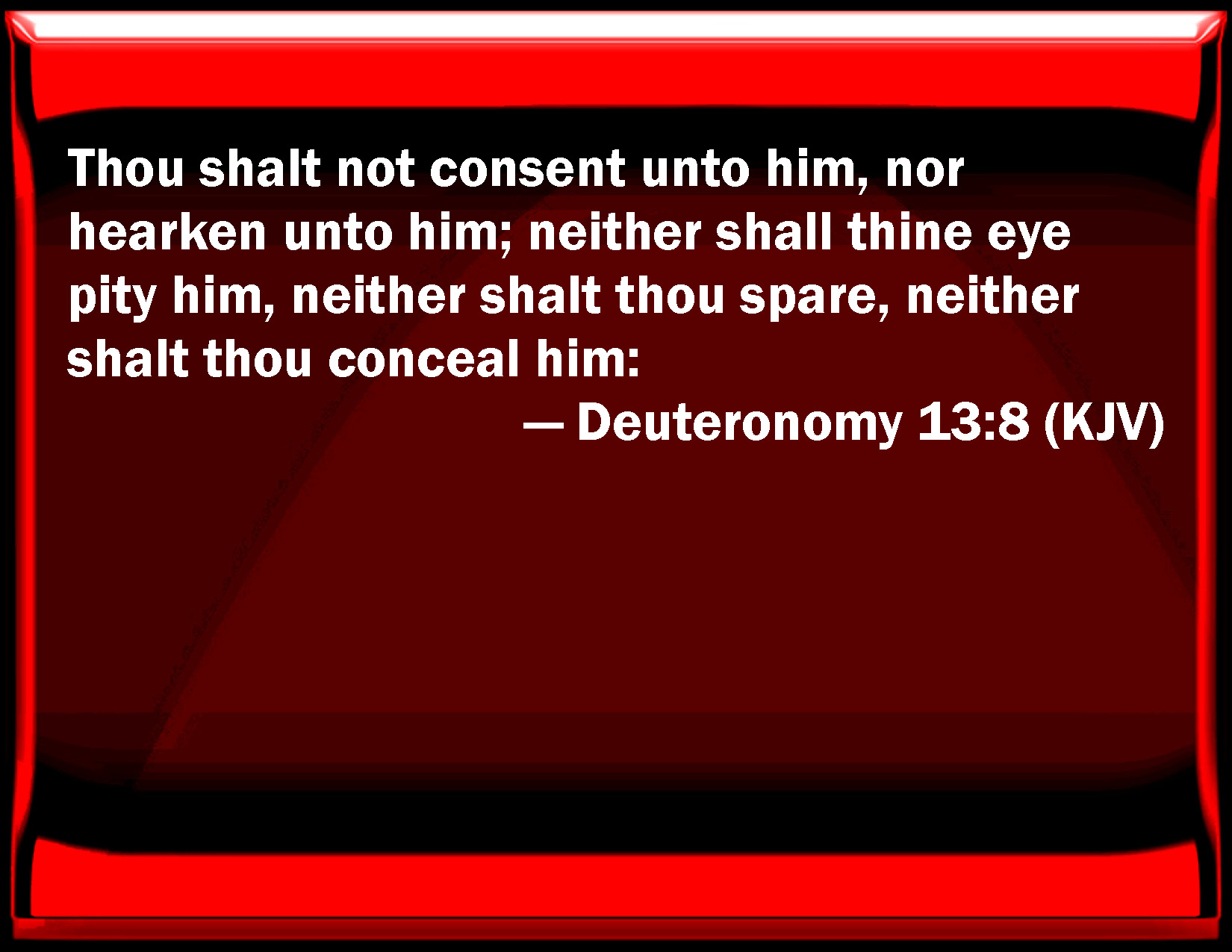 Bible Verse Slide Deuteronomy 13:8 You shall not consent to him, nor listen to him; neither shall your eye pity him, neither shall you spare, neither shall you conceal him: KJV: Thou shalt not consent unto him, nor hearken unto him; neither shall thine eye pity him, neither shalt thou spare, neither shalt thou conceal him: DRB: Consent not to him, hear him not, neither let thy eye spare him to pity and conceal him, DBT: thou shalt not consent unto him, nor hearken unto him; neither shall thine eye spare him, neither shalt thou pity him, neither shalt thou screen him, ERV: thou shalt not consent unto him, nor hearken unto him; neither shall thine eye pity him, neither shalt thou spare, neither shalt thou conceal him: WBT: Thou shalt not consent to him, nor hearken to him; neither shall thy eye pity him, neither shalt thou spare, neither shalt thou conceal him: WEB: you shall not consent to him, nor listen to him; neither shall your eye pity him, neither shall you spare, neither shall you conceal him: YLT: thou dost not consent to him, nor hearken unto him, nor doth thine eye have pity on him, nor dost thou spare, nor dost thou cover him over.Links Deuteronomy 13:8 NIV • Deuteronomy 13:8 NLT • Deuteronomy 13:8 ESV • Deuteronomy 13:8 NASB • Deuteronomy 13:8 KJV • Deuteronomy 13:8 Interlinear • Deuteronomy 13:8 Commentaries • Deuteronomy 13:8 Parallel Texts • Deuteronomy 13:8 Bible Apps • Deuteronomy 13:8 Parallel • Bible Hub |