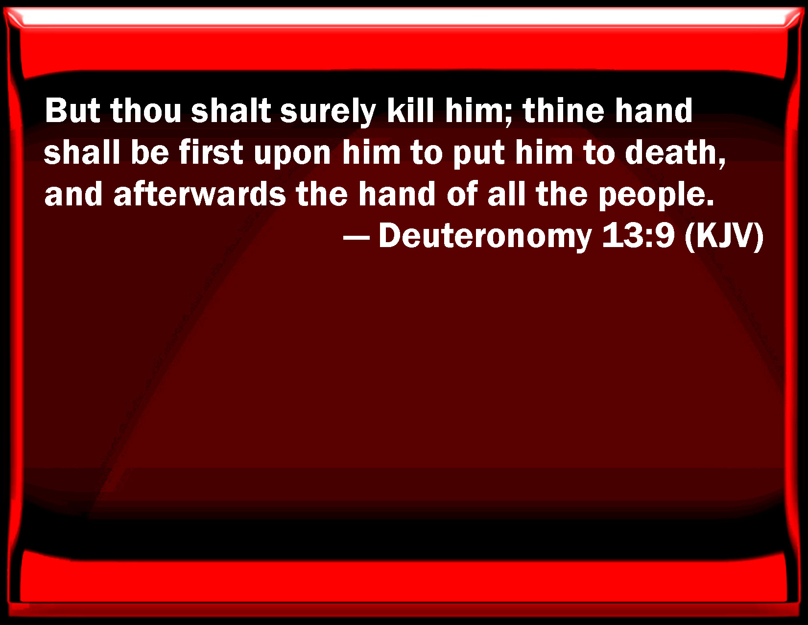 Bible Verse Slide Deuteronomy 13:9 But you shall surely kill him; your hand shall be first on him to put him to death, and afterwards the hand of all the people. KJV: But thou shalt surely kill him; thine hand shall be first upon him to put him to death, and afterwards the hand of all the people. DRB: But thou shalt presently put him to death. Let thy hand be first upon him, and afterwards the hands of all the people. DBT: but thou shalt in any case kill him: thy hand shall be the first against him to put him to death, and afterwards the hands of all the people; ERV: but thou shalt surely kill him; thine hand shall be first upon him to put him to death, and afterwards the hand of all the people. WBT: But thou shalt surely kill him; thy hand shall be first upon him to put him to death, and afterwards the hand of all the people. WEB: but you shall surely kill him; your hand shall be first on him to put him to death, and afterwards the hand of all the people. YLT: 'But thou dost surely kill him; thy hand is on him, in the first place, to put him to death, and the hand of all the people last;Links Deuteronomy 13:9 NIV • Deuteronomy 13:9 NLT • Deuteronomy 13:9 ESV • Deuteronomy 13:9 NASB • Deuteronomy 13:9 KJV • Deuteronomy 13:9 Interlinear • Deuteronomy 13:9 Commentaries • Deuteronomy 13:9 Parallel Texts • Deuteronomy 13:9 Bible Apps • Deuteronomy 13:9 Parallel • Bible Hub |