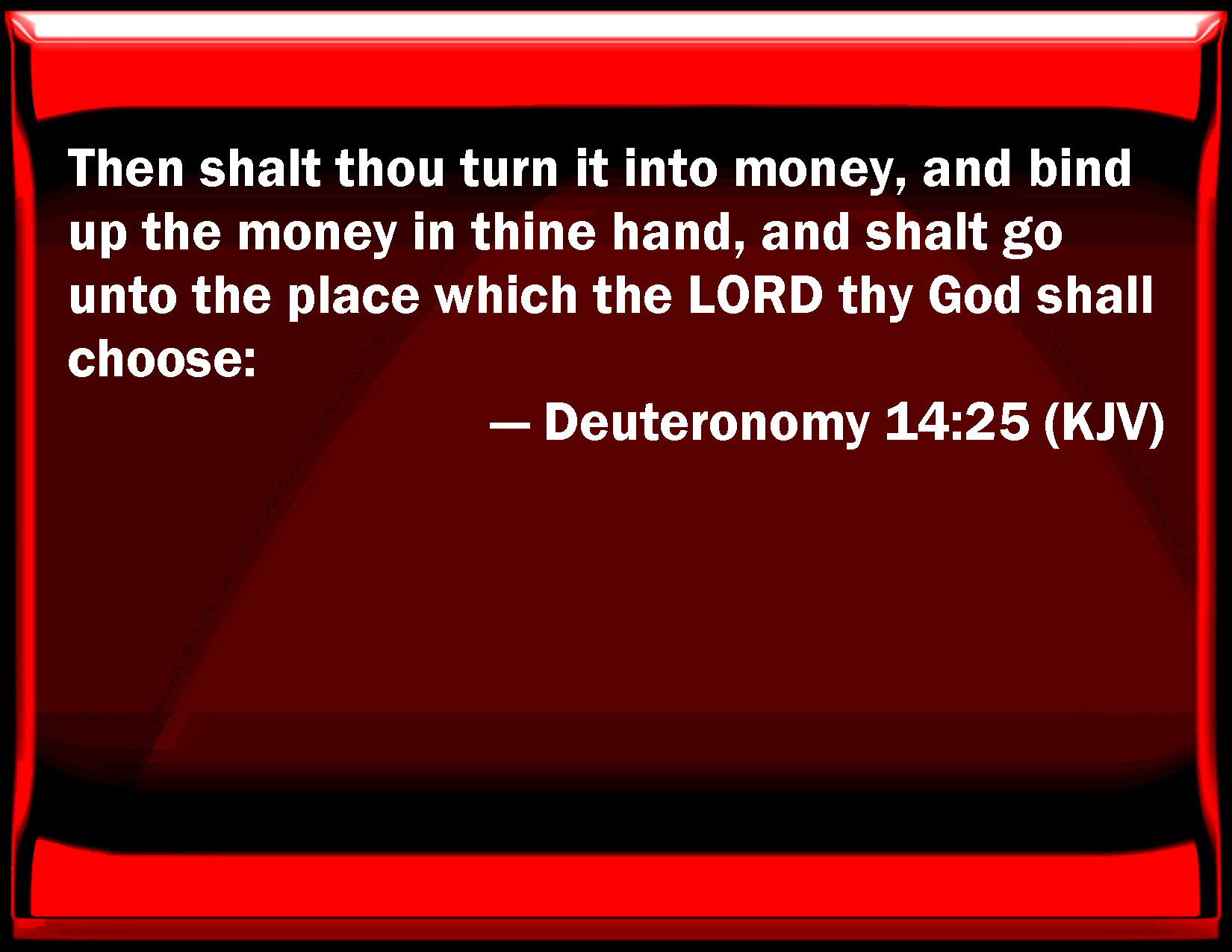 Bible Verse Slide Deuteronomy 14:25 Then shall you turn it into money, and bind up the money in your hand, and shall go to the place which the LORD your God shall choose: KJV: Then shalt thou turn it into money, and bind up the money in thine hand, and shalt go unto the place which the LORD thy God shall choose: DRB: Thou shalt sell them all, and turn them into money, and shalt carry it in thy hand, and shalt go to the place which the Lord shall choose : DBT: then shalt thou give it for money, and bind the money together in thy hand, and go to the place which Jehovah thy God will choose, ERV: then shalt thou turn it into money, and bind up the money in thine hand, and shalt go unto the place which the LORD thy God shall choose: WBT: Then shalt thou turn it into money, and bind up the money in thy hand, and shalt go to the place which the LORD thy God shall choose: WEB: then you shall turn it into money, and bind up the money in your hand, and shall go to the place which Yahweh your God shall choose: YLT: then thou hast given it in money, and hast bound up the money in thy hand, and gone unto the place on which Jehovah thy God doth fix;Links Deuteronomy 14:25 NIV • Deuteronomy 14:25 NLT • Deuteronomy 14:25 ESV • Deuteronomy 14:25 NASB • Deuteronomy 14:25 KJV • Deuteronomy 14:25 Interlinear • Deuteronomy 14:25 Commentaries • Deuteronomy 14:25 Parallel Texts • Deuteronomy 14:25 Bible Apps • Deuteronomy 14:25 Parallel • Bible Hub |