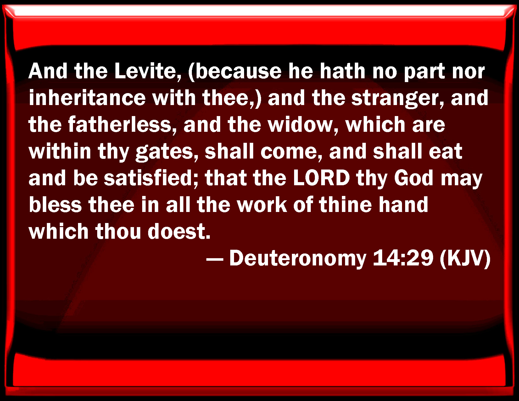 Bible Verse Slide Deuteronomy 14:29 And the Levite, (because he has no part nor inheritance with you,) and the stranger, and the fatherless, and the widow, which are within your gates, shall come, and shall eat and be satisfied; that the LORD your God may bless you in all the work of your hand which you do. KJV: And the Levite, (because he hath no part nor inheritance with thee,) and the stranger, and the fatherless, and the widow, which are within thy gates, shall come, and shall eat and be satisfied; that the LORD thy God may bless thee in all the work of thine hand which thou doest. DRB: And the Levite that hath no other part nor possession with thee, and the stranger and the fatherless and the widow, that are within thy gates, shall come and shall eat and be filled: that the Lord thy God may bless thee in all the works of thy hands that thou shalt do. DBT: and the Levite for he hath no portion nor inheritance with thee and the stranger, and the fatherless, and the widow, that are within thy gates, shall come, and shall eat and be satisfied; that Jehovah thy God may bless thee in all the work of thy hand which thou doest. ERV: and the Levite, because he hath no portion nor inheritance with thee, and the stranger, and the fatherless, and the widow, which are within thy gates, shall come, and shall eat and be satisfied; that the LORD thy God may bless thee in all the work of thine hand which thou doest. WBT: And the Levite, (because he hath no part nor inheritance with thee) and the stranger, and the fatherless, and the widow, who are within thy gates, shall come, and shall eat and be satisfied; that the LORD thy God may bless thee in all the work of thy hand which thou doest. WEB: and the Levite, because he has no portion nor inheritance with you, and the foreigner living among you, and the fatherless, and the widow, who are within your gates, shall come, and shall eat and be satisfied; that Yahweh your God may bless you in all the work of your hand which you do. YLT: and come in hath the Levite (for he hath no part and inheritance with thee), and the sojourner, and the fatherless, and the widow, who are within thy gates, and they have eaten, and been satisfied, so that Jehovah thy God doth bless thee in all the work of thy hand which thou dost.Links Deuteronomy 14:29 NIV • Deuteronomy 14:29 NLT • Deuteronomy 14:29 ESV • Deuteronomy 14:29 NASB • Deuteronomy 14:29 KJV • Deuteronomy 14:29 Interlinear • Deuteronomy 14:29 Commentaries • Deuteronomy 14:29 Parallel Texts • Deuteronomy 14:29 Bible Apps • Deuteronomy 14:29 Parallel • Bible Hub |