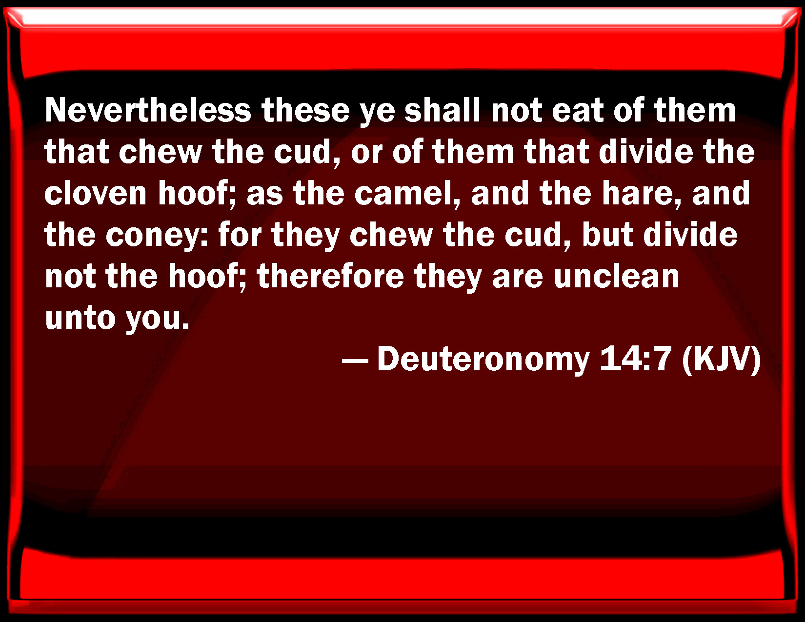 Bible Verse Slide Deuteronomy 14:7 Nevertheless these you shall not eat of them that chew the cud, or of them that divide the cloven hoof; as the camel, and the hare, and the coney: for they chew the cud, but divide not the hoof; therefore they are unclean to you. KJV: Nevertheless these ye shall not eat of them that chew the cud, or of them that divide the cloven hoof; as the camel, and the hare, and the coney: for they chew the cud, but divide not the hoof; therefore they are unclean unto you. DRB: But of them that chew the cud, but divide not the hoof, you shall not eat, such as the camel, the hare, and the cherogril: because they chew the cud, but divide not the hoof, they shall be unclean to you. DBT: Only these ye shall not eat of those that chew the cud, or of those with hoofs cloven and split open: the camel, and the hare, and the rock-badger; for they chew the cud, but have not cloven hoofs they shall be unclean unto you; ERV: Nevertheless these ye shall not eat of them that chew the cud, or of them that have the hoof cloven: the camel, and the hare, and the coney, because they chew the cud but part not the hoof, they are unclean unto you: WBT: Nevertheless, these ye shall not eat, of them that chew the cud, or of them that divide the cloven hoof; the camel, and the hare, and the coney: for they chew the cud, but divide not the hoof; therefore they are unclean to you. WEB: Nevertheless these you shall not eat of them that chew the cud, or of those who have the hoof cloven: the camel, and the hare, and the rabbit; because they chew the cud but don't part the hoof, they are unclean to you. YLT: Only, this ye do not eat, of those bringing up the cud, and of those dividing the cloven hoof: the camel, and the hare, and the rabbit, for they are bringing up the cud but the hoof have not divided; unclean they are to you;Links Deuteronomy 14:7 NIV • Deuteronomy 14:7 NLT • Deuteronomy 14:7 ESV • Deuteronomy 14:7 NASB • Deuteronomy 14:7 KJV • Deuteronomy 14:7 Interlinear • Deuteronomy 14:7 Commentaries • Deuteronomy 14:7 Parallel Texts • Deuteronomy 14:7 Bible Apps • Deuteronomy 14:7 Parallel • Bible Hub |