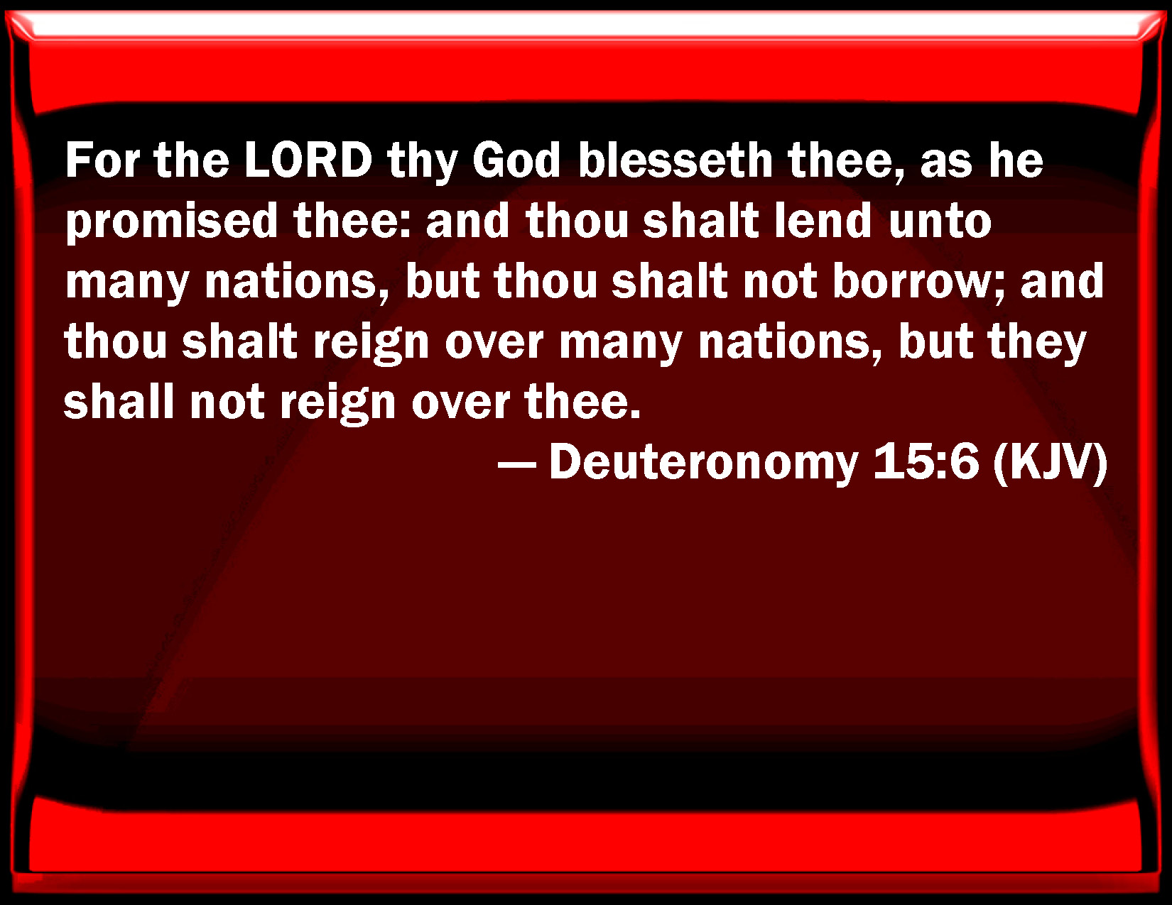 Bible Verse Slide Deuteronomy 15:6 For the LORD your God blesses you, as he promised you: and you shall lend to many nations, but you shall not borrow; and you shall reign over many nations, but they shall not reign over you. KJV: For the LORD thy God blesseth thee, as he promised thee: and thou shalt lend unto many nations, but thou shalt not borrow; and thou shalt reign over many nations, but they shall not reign over thee. DRB: Thou shalt lend to many nations, and thou shalt borrow of no man. Thou shalt have dominion over very many nations, and no one shall have dominion over thee. DBT: For Jehovah thy God will bless thee, as he promised thee; and thou shalt lend on pledge to many nations, but thou shalt not borrow; and thou shalt rule over many nations, but they shall not rule over thee. ERV: For the LORD thy God will bless thee, as he promised thee: and thou shalt lend unto many nations, but thou shalt not borrow; and thou shalt rule over many nations, but they shall not rule over thee. WBT: For the LORD thy God shall bless thee, as he promised thee: and thou shalt lend to many nations, but thou shalt not borrow; and thou shalt reign over many nations, but they shall not reign over thee. WEB: For Yahweh your God will bless you, as he promised you: and you shall lend to many nations, but you shall not borrow; and you shall rule over many nations, but they shall not rule over you. YLT: for Jehovah thy God hath blessed thee as He hath spoken to thee; and thou hast lent to many nations, and thou hast not borrowed; and thou hast ruled over many nations, and over thee they do not rule.Links Deuteronomy 15:6 NIV • Deuteronomy 15:6 NLT • Deuteronomy 15:6 ESV • Deuteronomy 15:6 NASB • Deuteronomy 15:6 KJV • Deuteronomy 15:6 Interlinear • Deuteronomy 15:6 Commentaries • Deuteronomy 15:6 Parallel Texts • Deuteronomy 15:6 Bible Apps • Deuteronomy 15:6 Parallel • Bible Hub |