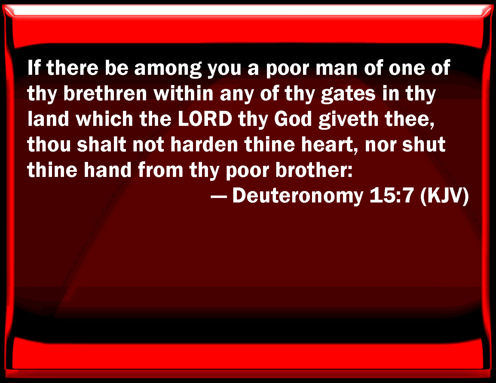 Bible Verse Slide Deuteronomy 15:7 If there be among you a poor man of one of your brothers within any of your gates in your land which the LORD your God gives you, you shall not harden your heart, nor shut your hand from your poor brother: KJV: If there be among you a poor man of one of thy brethren within any of thy gates in thy land which the LORD thy God giveth thee, thou shalt not harden thine heart, nor shut thine hand from thy poor brother: DRB: If one of thy brethren that dwelleth within the gates of thy city in the land which the Lord thy God will give thee, come to poverty: thou shalt not harden thy heart, nor close thy hand, DBT: If there be amongst you a poor man, any one of thy brethren in one of thy gates, in thy land which Jehovah thy God giveth thee, thou shalt not harden thy heart, nor shut thy hand from thy brother in need; ERV: If there be with thee a poor man, one of thy brethren, within any of thy gates in thy land which the LORD thy God giveth thee, thou shalt not harden thine heart, nor shut thine hand from thy poor brother: WBT: If there shall be among you a poor man of one of thy brethren within any of thy gates in thy land which the LORD the God giveth thee, thou shalt not harden thy heart, nor shut thy hand from thy poor brother: WEB: If a poor man, one of your brothers, is with you within any of your gates in your land which Yahweh your God gives you, you shall not harden your heart, nor shut your hand from your poor brother; YLT: 'When there is with thee any needy one of one of thy brethren, in one of thy cities, in thy land which Jehovah thy God is giving to thee, thou dost not harden thy heart, nor shut thy hand from thy needy brother;Links Deuteronomy 15:7 NIV • Deuteronomy 15:7 NLT • Deuteronomy 15:7 ESV • Deuteronomy 15:7 NASB • Deuteronomy 15:7 KJV • Deuteronomy 15:7 Interlinear • Deuteronomy 15:7 Commentaries • Deuteronomy 15:7 Parallel Texts • Deuteronomy 15:7 Bible Apps • Deuteronomy 15:7 Parallel • Bible Hub |