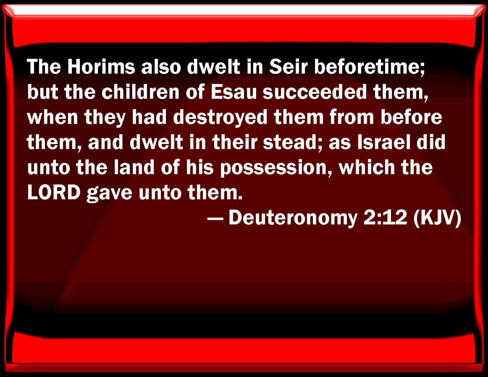 Bible Verse Slide Deuteronomy 2:12 The Horims also dwelled in Seir beforetime; but the children of Esau succeeded them, when they had destroyed them from before them, and dwelled in their stead; as Israel did to the land of his possession, which the LORD gave to them. KJV: The Horims also dwelt in Seir beforetime; but the children of Esau succeeded them, when they had destroyed them from before them, and dwelt in their stead; as Israel did unto the land of his possession, which the LORD gave unto them. DRB: The Horrhites also formerly dwelt in Seir: who being driven out and destroyed, the children of Esau dwelt there, as Israel did in the land of his possession, which the Lord gave him. DBT: And in Seir dwelt the Horites in times past; and the children of Esau dispossessed them, and destroyed them from before them, and dwelt in their stead; as Israel did to the land of their possession, which Jehovah gave to them.) ERV: The Horites also dwelt in Seir aforetime, but the children of Esau succeeded them; and they destroyed them from before them, and dwelt in their stead; as Israel did unto the land of his possession, which the LORD gave unto them.) WBT: The Horims also dwelt formerly in Seir, but the children of Esau succeeded them, when they had destroyed them from before them, and dwelt in their stead; as Israel did to the land of his possession, which the LORD gave to them.) WEB: The Horites also lived in Seir before, but the children of Esau succeeded them; and they destroyed them from before them, and lived in their place; as Israel did to the land of his possession, which Yahweh gave to them.) YLT: And in Seir have the Horim dwelt formerly; and the sons of Esau dispossess them, and destroy them from before them, and dwell in their stead, as Israel hath done to the land of his possession, which Jehovah hath given to them;Links Deuteronomy 2:12 NIV • Deuteronomy 2:12 NLT • Deuteronomy 2:12 ESV • Deuteronomy 2:12 NASB • Deuteronomy 2:12 KJV • Deuteronomy 2:12 Interlinear • Deuteronomy 2:12 Commentaries • Deuteronomy 2:12 Parallel Texts • Deuteronomy 2:12 Bible Apps • Deuteronomy 2:12 Parallel • Bible Hub |