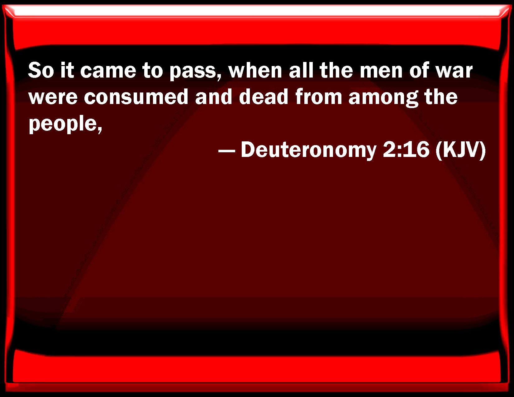 Bible Verse Slide Deuteronomy 2:16 So it came to pass, when all the men of war were consumed and dead from among the people, KJV: So it came to pass, when all the men of war were consumed and dead from among the people, DRB: And after all the fighting men were dead, DBT: And it came to pass when all the men of war were consumed, having died off from among the people, ERV: So it came to pass, when all the men of war were consumed and dead from among the people, WBT: So it came to pass, when all the men of war were consumed and dead from among the people, WEB: So it happened, when all the men of war were consumed and dead from among the people, YLT: 'And it cometh to pass, when all the men of battle have finished dying from the midst of the people,Links Deuteronomy 2:16 NIV • Deuteronomy 2:16 NLT • Deuteronomy 2:16 ESV • Deuteronomy 2:16 NASB • Deuteronomy 2:16 KJV • Deuteronomy 2:16 Interlinear • Deuteronomy 2:16 Commentaries • Deuteronomy 2:16 Parallel Texts • Deuteronomy 2:16 Bible Apps • Deuteronomy 2:16 Parallel • Bible Hub |