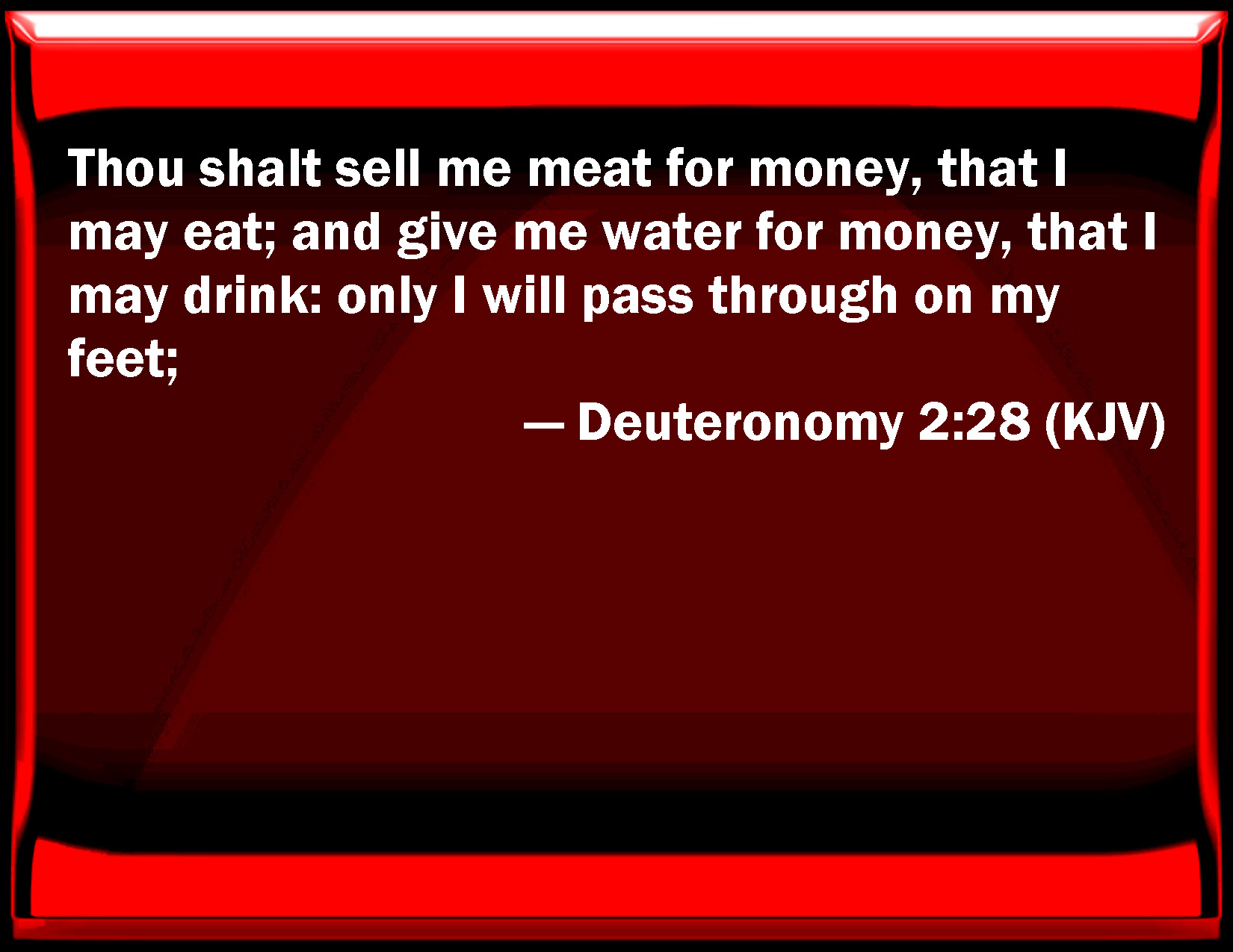Bible Verse Slide Deuteronomy 2:28 You shall sell me meat for money, that I may eat; and give me water for money, that I may drink: only I will pass through on my feet; KJV: Thou shalt sell me meat for money, that I may eat; and give me water for money, that I may drink: only I will pass through on my feet; DRB: Sell us meat for money, that we may eat: give us water for money and so we will drink. We only ask that thou wilt let us pass through, DBT: Thou shalt sell me food for money that I may eat; and thou shalt give me water for money that I may drink; I will only pass through on my feet, ERV: Thou shalt sell me food for money, that I may eat; and give me water for money, that I may drink: only let me pass through on my feet; WBT: Thou shalt sell me food for money, that I may eat; and give me water for money, that I may drink: only I will pass through on my feet; WEB: You shall sell me food for money, that I may eat; and give me water for money, that I may drink: only let me pass through on my feet, YLT: food for money thou dost sell me, and I have eaten; and water for money thou dost give to me, and I have drunk; only, let me pass over on my feet, — Links Deuteronomy 2:28 NIV • Deuteronomy 2:28 NLT • Deuteronomy 2:28 ESV • Deuteronomy 2:28 NASB • Deuteronomy 2:28 KJV • Deuteronomy 2:28 Interlinear • Deuteronomy 2:28 Commentaries • Deuteronomy 2:28 Parallel Texts • Deuteronomy 2:28 Bible Apps • Deuteronomy 2:28 Parallel • Bible Hub |