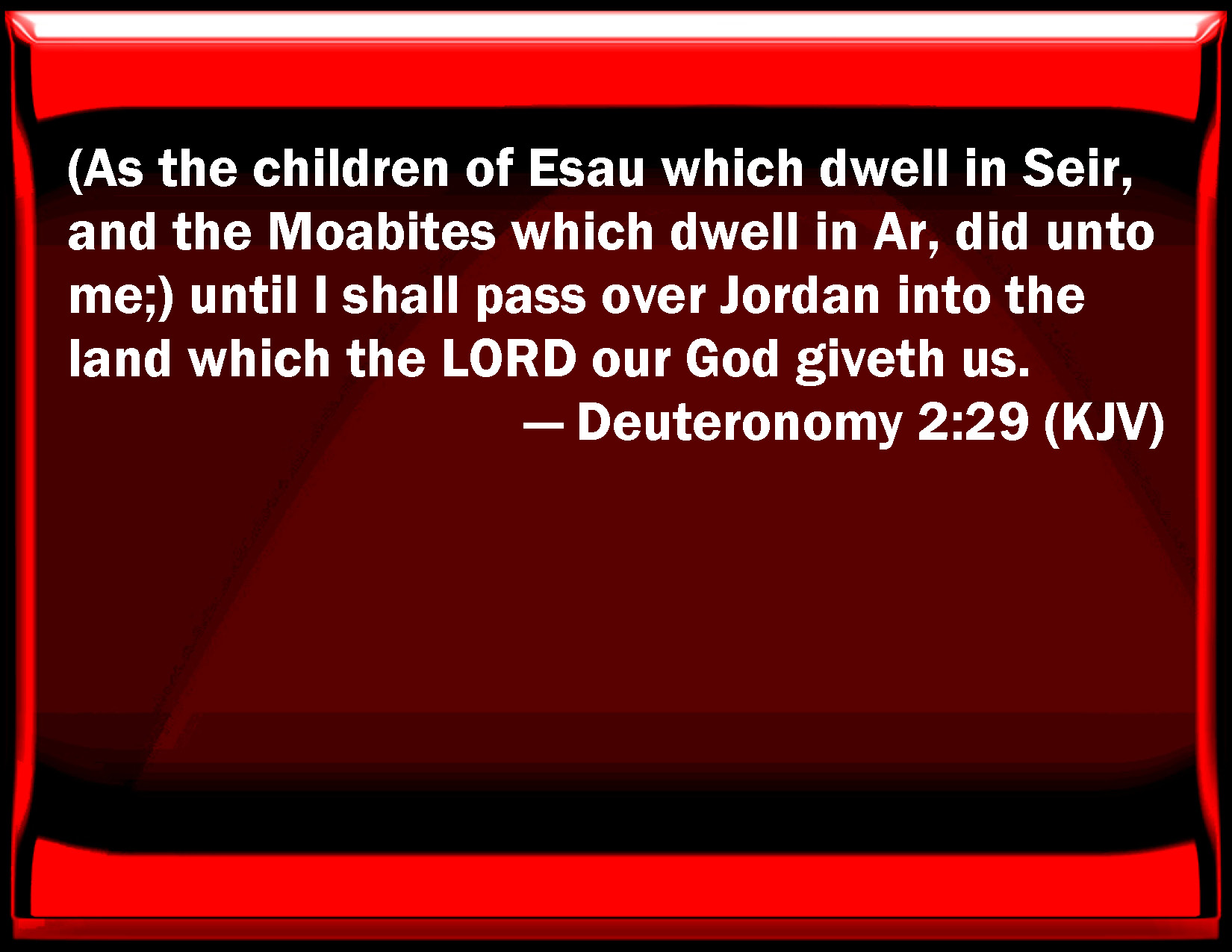 Bible Verse Slide Deuteronomy 2:29 (As the children of Esau which dwell in Seir, and the Moabites which dwell in Ar, did to me;) until I shall pass over Jordan into the land which the LORD our God gives us. KJV: (As the children of Esau which dwell in Seir, and the Moabites which dwell in Ar, did unto me;) until I shall pass over Jordan into the land which the LORD our God giveth us. DRB: As the children of Esau have done, that dwell in Seir, and the Moabites, that abide in Ar: until we come to the Jordan, and pass to the land which the Lord our God will give us. DBT: as the children of Esau who dwell in Seir, and the Moabites who dwell in Ar, did to me, until I shall pass over the Jordan into the land which Jehovah our God giveth us. ERV: as the children of Esau which dwell in Seir, and the Moabites which dwell in Ar, did unto me; until I shall pass over Jordan into the land which the LORD our God giveth us. WBT: (As the children of Esau who dwell in Seir, and the Moabites who dwell in Ar, did to me;) until I shall pass over Jordan into the land which the LORD our God giveth us. WEB: as the children of Esau who dwell in Seir, and the Moabites who dwell in Ar, did to me; until I shall pass over the Jordan into the land which Yahweh our God gives us." YLT: as the sons of Esau who are dwelling in Seir, and the Moabites who are dwelling in Ar, have done to me — till that I pass over the Jordan, unto the land which Jehovah our God is giving to us.Links Deuteronomy 2:29 NIV • Deuteronomy 2:29 NLT • Deuteronomy 2:29 ESV • Deuteronomy 2:29 NASB • Deuteronomy 2:29 KJV • Deuteronomy 2:29 Interlinear • Deuteronomy 2:29 Commentaries • Deuteronomy 2:29 Parallel Texts • Deuteronomy 2:29 Bible Apps • Deuteronomy 2:29 Parallel • Bible Hub |
