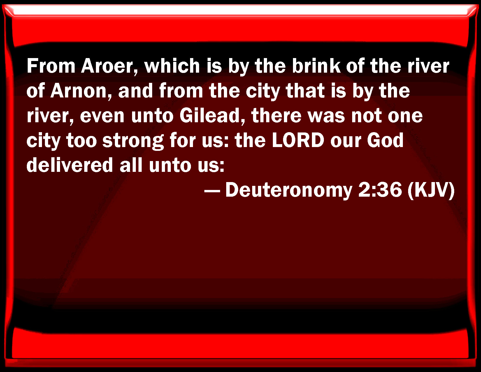 Bible Verse Slide Deuteronomy 2:36 From Aroer, which is by the brink of the river of Arnon, and from the city that is by the river, even to Gilead, there was not one city too strong for us: the LORD our God delivered all to us: KJV: From Aroer, which is by the brink of the river of Arnon, and from the city that is by the river, even unto Gilead, there was not one city too strong for us: the LORD our God delivered all unto us: DRB: From Aroer, which is upon the bank of the torrent Amen, a town that is situate in a valley, as far as Galaad. There was not a village or city, that escaped our hands: the Lord our God delivered all unto us: DBT: From Aroer, which is on the bank of the river Arnon, and the city that is in the ravine even to Gilead, there was not one city too strong for us: Jehovah our God delivered all before us. ERV: From Aroer, which is on the edge of the valley of Arnon, and from the city that is in the valley, even unto Gilead, there was not a city too high for us: the LORD our God delivered up all before us: WBT: From Aroer, which is by the brink of the river of Arnon, and from the city that is by the river, even to Gilead, there was not one city too strong for us: the LORD our God delivered all to us: WEB: From Aroer, which is on the edge of the valley of the Arnon, and [from] the city that is in the valley, even to Gilead, there was not a city too high for us; Yahweh our God delivered up all before us: YLT: From Aroer, which is by the edge of the brook Arnon, and the city which is by the brook, even unto Gilead there hath not been a city which is too high for us; the whole hath Jehovah our God given before us.Links Deuteronomy 2:36 NIV • Deuteronomy 2:36 NLT • Deuteronomy 2:36 ESV • Deuteronomy 2:36 NASB • Deuteronomy 2:36 KJV • Deuteronomy 2:36 Interlinear • Deuteronomy 2:36 Commentaries • Deuteronomy 2:36 Parallel Texts • Deuteronomy 2:36 Bible Apps • Deuteronomy 2:36 Parallel • Bible Hub |