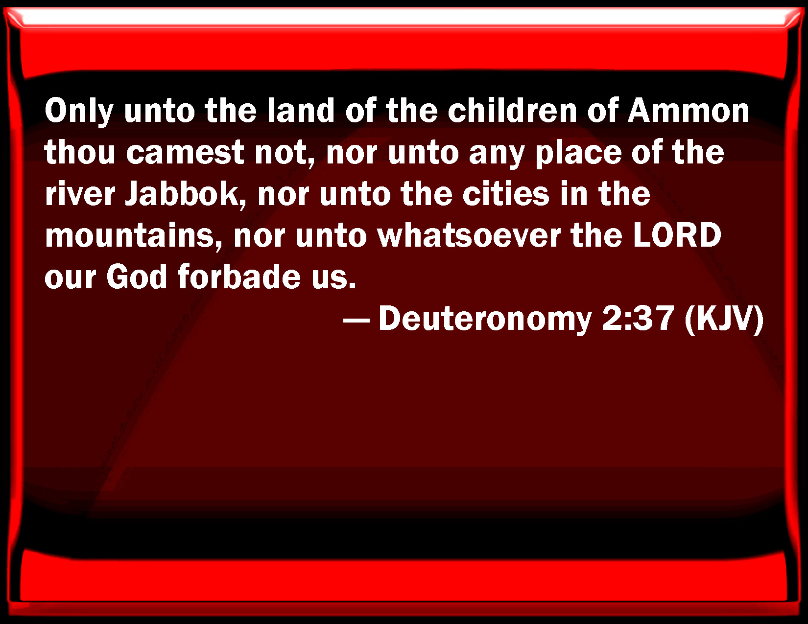 Bible Verse Slide Deuteronomy 2:37 Only to the land of the children of Ammon you came not, nor to any place of the river Jabbok, nor to the cities in the mountains, nor to whatever the LORD our God forbade us. KJV: Only unto the land of the children of Ammon thou camest not, nor unto any place of the river Jabbok, nor unto the cities in the mountains, nor unto whatsoever the LORD our God forbad us. DRB: Except the land of the children of Ammon, to which we approached not: and all that border upon the torrent Jeboc, and the cities in the mountains, and all the places which the Lord our God forbade us. DBT: Only thou didst not approach the land of the children of Ammon, the whole border of the river Jabbok, nor the cities of the mountain, nor to whatsoever Jehovah our God had forbidden us. ERV: only to the land of the children of Ammon thou camest not near; all the side of the river Jabbok, and the cities of the hill country, and wheresoever the LORD our God forbade us. WBT: Only to the land of the children of Ammon thou camest not, nor to any place of the river Jabbok, nor to the cities on the mountains, nor to whatever the LORD our God forbad us. WEB: only to the land of the children of Ammon you didn't come near; all the side of the river Jabbok, and the cities of the hill country, and wherever Yahweh our God forbade us. YLT: Only, unto the land of the sons of Ammon thou hast not drawn near, any part of the brook Jabbok, and cities of the hill-country, and anything which Jehovah our God hath not commanded.Links Deuteronomy 2:37 NIV • Deuteronomy 2:37 NLT • Deuteronomy 2:37 ESV • Deuteronomy 2:37 NASB • Deuteronomy 2:37 KJV • Deuteronomy 2:37 Interlinear • Deuteronomy 2:37 Commentaries • Deuteronomy 2:37 Parallel Texts • Deuteronomy 2:37 Bible Apps • Deuteronomy 2:37 Parallel • Bible Hub |