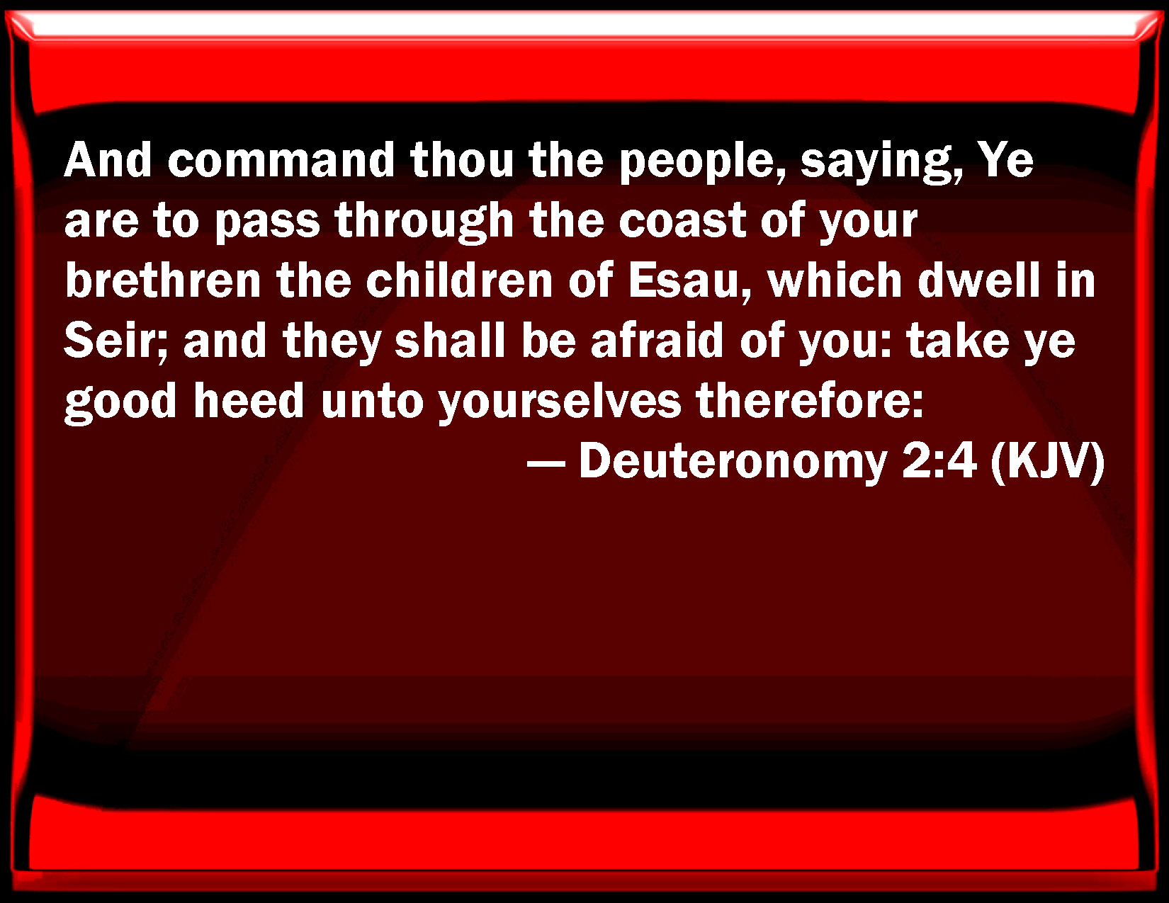Bible Verse Slide Deuteronomy 2:4 And command you the people, saying, You are to pass through the coast of your brothers the children of Esau, which dwell in Seir; and they shall be afraid of you: take you good heed to yourselves therefore: KJV: And command thou the people, saying, Ye are to pass through the coast of your brethren the children of Esau, which dwell in Seir; and they shall be afraid of you: take ye good heed unto yourselves therefore: DRB: And command thou the people, saying: You shall pass by the borders of your brethren the children of Esau, who dwell in Seir, and they will be afraid of you. DBT: And command the people, saying, Ye are to pass through the border of your brethren the children of Esau, who dwell in Seir; and they will be afraid of you; and ye shall be very guarded: ERV: And command thou the people, saying, Ye are to pass through the border of your brethren the children of Esau, which dwell in Seir; and they shall be afraid of you: take ye good heed unto yourselves therefore: WBT: And command thou the people, saying, Ye are to pass through the border of your brethren the children of Esau, who dwell in Seir; and they will be afraid of you: therefore take ye good heed to yourselves: WEB: Command the people, saying, 'You are to pass through the border of your brothers the children of Esau, who dwell in Seir; and they will be afraid of you: take good heed to yourselves therefore; YLT: 'And the people command thou, saying, Ye are passing over into the border of your brethren, sons of Esau, who are dwelling in Seir, and they are afraid of you; and ye have been very watchful,Links Deuteronomy 2:4 NIV • Deuteronomy 2:4 NLT • Deuteronomy 2:4 ESV • Deuteronomy 2:4 NASB • Deuteronomy 2:4 KJV • Deuteronomy 2:4 Interlinear • Deuteronomy 2:4 Commentaries • Deuteronomy 2:4 Parallel Texts • Deuteronomy 2:4 Bible Apps • Deuteronomy 2:4 Parallel • Bible Hub |