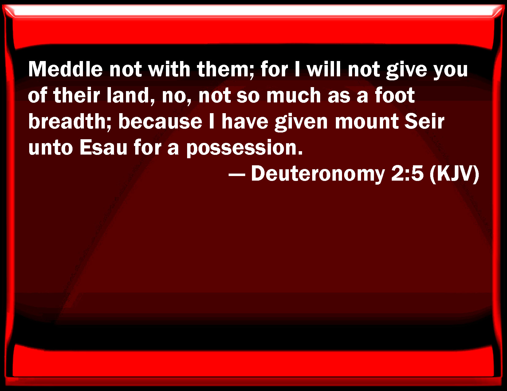 Bible Verse Slide Deuteronomy 2:5 Meddle not with them; for I will not give you of their land, no, not so much as a foot breadth; because I have given mount Seir to Esau for a possession. KJV: Meddle not with them; for I will not give you of their land, no, not so much as a foot breadth; because I have given mount Seir unto Esau for a possession. DRB: Take ye then good heed that you stir not against them. For I will not give you of their land so much as the step of one foot can tread upon, because I have given mount Seir to Esau, for a possession. DBT: attack them not; for I will not give you of their land, no, not so much as a foot-breadth; for I have given mount Seir as a possession unto Esau. ERV: contend not with them; for I will not give you of their land, no, not so much as for the sole of the foot to tread on: because I have given mount Seir unto Esau for a possession. WBT: Meddle not with them; for I will not give you of their land, no, not so much as a foot-breadth; because I have given mount Seir to Esau for a possession. WEB: don't contend with them; for I will not give you of their land, no, not so much as for the sole of the foot to tread on; because I have given Mount Seir to Esau for a possession. YLT: ye do not strive with them, for I do not give to you of their land even the treading of the sole of a foot; for a possession to Esau I have given mount Seir.Links Deuteronomy 2:5 NIV • Deuteronomy 2:5 NLT • Deuteronomy 2:5 ESV • Deuteronomy 2:5 NASB • Deuteronomy 2:5 KJV • Deuteronomy 2:5 Interlinear • Deuteronomy 2:5 Commentaries • Deuteronomy 2:5 Parallel Texts • Deuteronomy 2:5 Bible Apps • Deuteronomy 2:5 Parallel • Bible Hub |