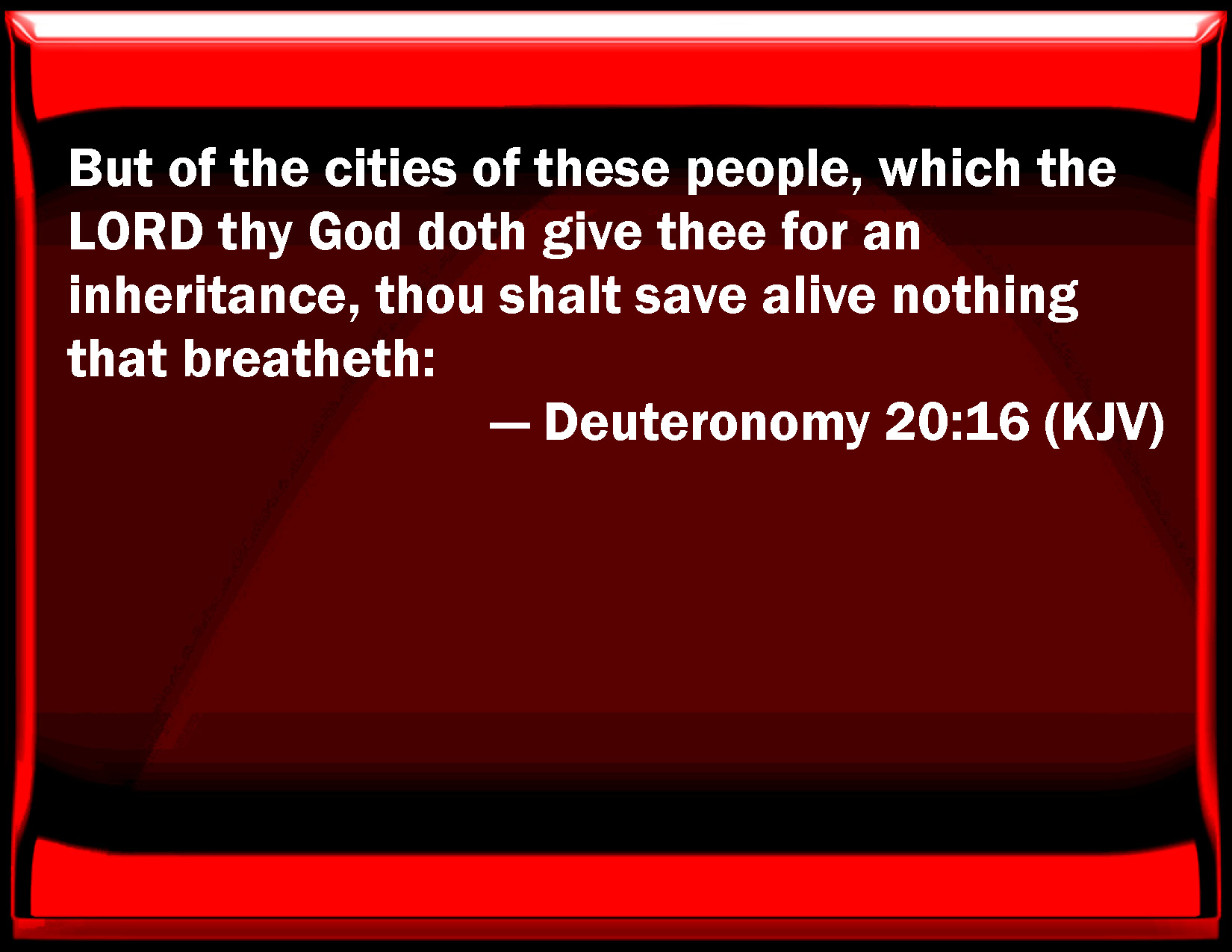Bible Verse Slide Deuteronomy 20:16 But of the cities of these people, which the LORD your God does give you for an inheritance, you shall save alive nothing that breathes: KJV: But of the cities of these people, which the LORD thy God doth give thee for an inheritance, thou shalt save alive nothing that breatheth: DRB: But of those cities that shall be given thee, thou shalt suffer none at all to live: DBT: But of the cities of these peoples which Jehovah thy God giveth thee for an inheritance, thou shalt save alive nothing that breatheth, ERV: But of the cities of these peoples, which the LORD thy God giveth thee for an inheritance, thou shalt save alive nothing that breatheth: WBT: But of the cities of these people which the LORD thy God doth give thee for an inheritance, thou shalt save alive nothing that breatheth: WEB: But of the cities of these peoples, that Yahweh your God gives you for an inheritance, you shall save alive nothing that breathes; YLT: Only, of the cities of these peoples which Jehovah thy God is giving to thee for an inheritance, thou dost not keep alive any breathing;Links Deuteronomy 20:16 NIV • Deuteronomy 20:16 NLT • Deuteronomy 20:16 ESV • Deuteronomy 20:16 NASB • Deuteronomy 20:16 KJV • Deuteronomy 20:16 Interlinear • Deuteronomy 20:16 Commentaries • Deuteronomy 20:16 Parallel Texts • Deuteronomy 20:16 Bible Apps • Deuteronomy 20:16 Parallel • Bible Hub |