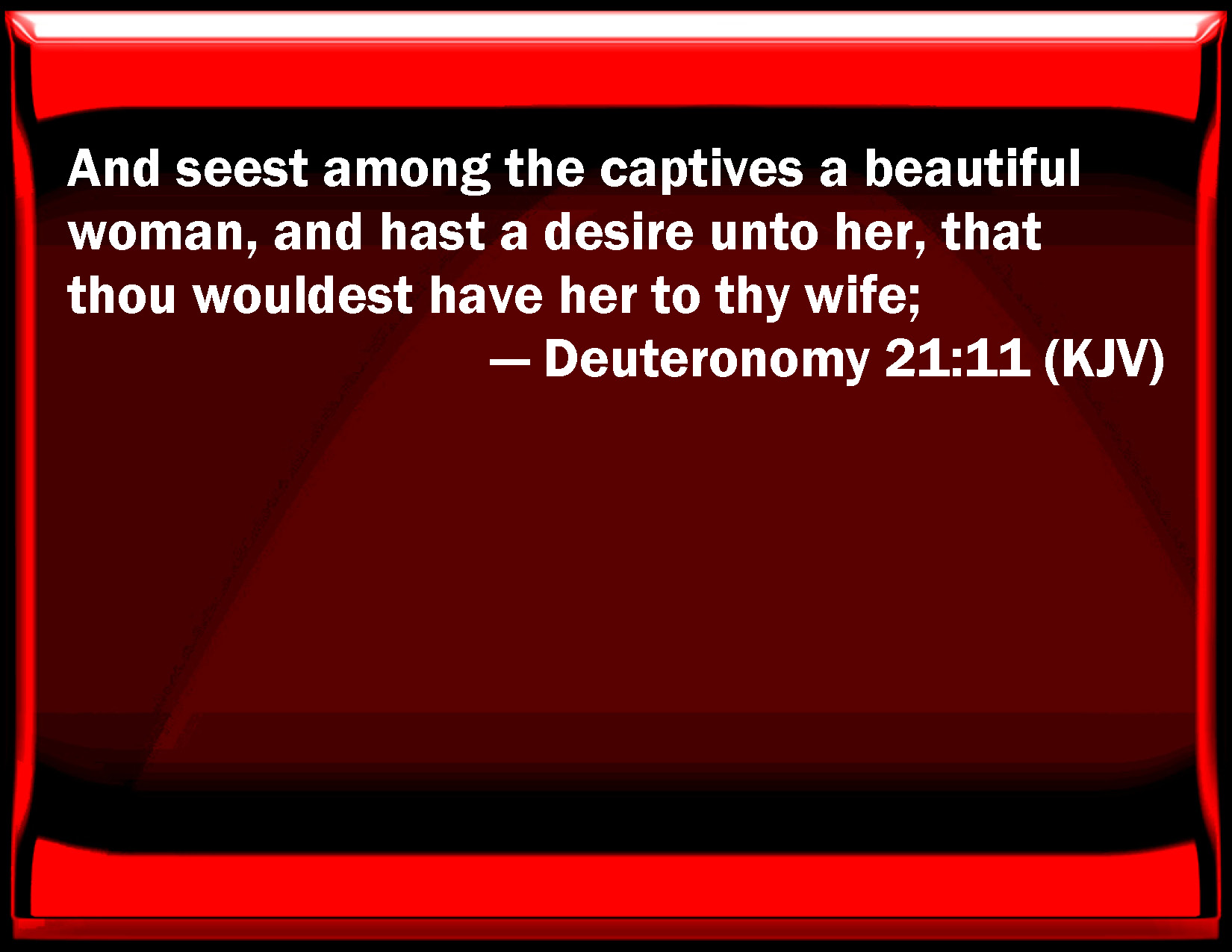 Bible Verse Slide Deuteronomy 21:11 And see among the captives a beautiful woman, and have a desire to her, that you would have her to your wife; KJV: And seest among the captives a beautiful woman, and hast a desire unto her, that thou wouldest have her to thy wife; DRB: And seest in the number of the captives a beautiful woman, and lovest her, and wilt have her to wife, DBT: and thou seest among the captives a woman of beautiful form, and hast a desire unto her, and takest her as thy wife; ERV: and seest among the captives a beautiful woman, and thou hast a desire unto her, and wouldest take her to thee to wife; WBT: And thou seest among the captives a beautiful woman, and hast a desire to her, that thou wouldest have her for thy wife: WEB: and see among the captives a beautiful woman, and you have a desire to her, and would take her to you as wife; YLT: and hast seen in the captivity a woman of fair form, and hast delighted in her, and hast taken to thee for a wife,Links Deuteronomy 21:11 NIV • Deuteronomy 21:11 NLT • Deuteronomy 21:11 ESV • Deuteronomy 21:11 NASB • Deuteronomy 21:11 KJV • Deuteronomy 21:11 Interlinear • Deuteronomy 21:11 Commentaries • Deuteronomy 21:11 Parallel Texts • Deuteronomy 21:11 Bible Apps • Deuteronomy 21:11 Parallel • Bible Hub |