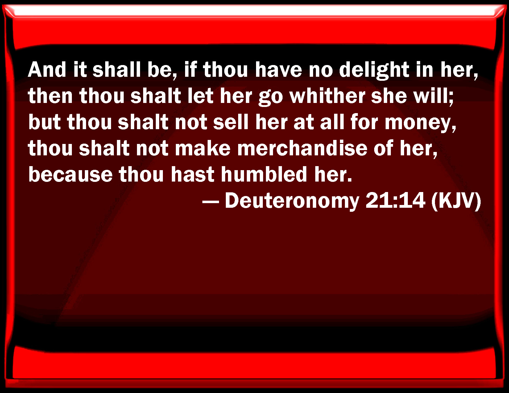 Bible Verse Slide Deuteronomy 21:14 And it shall be, if you have no delight in her, then you shall let her go where she will; but you shall not sell her at all for money, you shall not make merchandise of her, because you have humbled her. KJV: And it shall be, if thou have no delight in her, then thou shalt let her go whither she will; but thou shalt not sell her at all for money, thou shalt not make merchandise of her, because thou hast humbled her. DRB: Rut if afterwards she please thee not, thou shalt let her go free, but thou mayst not sell her for money nor oppress her by might because thou hast humbled her. DBT: And it shall be, if thou have no delight in her, then thou shalt let her go according to her desire; but thou shalt in no wise sell her for money; thou shalt not treat her as a slave, because thou hast humbled her. ERV: And it shall be, if thou have no delight in her, then thou shalt let her go whither she will; but thou shalt not sell her at all for money, thou shalt not deal with her as a slave, because thou hast humbled her. WBT: And it shall be, if thou shalt have no delight in her, then thou shalt let her go whither she will; but thou shalt not sell her at all for money; thou shalt not make merchandise of her, because thou hast humbled her. WEB: It shall be, if you have no delight in her, then you shall let her go where she will; but you shall not sell her at all for money, you shall not deal with her as a slave, because you have humbled her. YLT: And it hath been — if thou hast not delighted in her, that thou hast sent her away at her desire, and thou dost not at all sell her for money; thou dost not tyrannize over her, because that thou hast humbled her.Links Deuteronomy 21:14 NIV • Deuteronomy 21:14 NLT • Deuteronomy 21:14 ESV • Deuteronomy 21:14 NASB • Deuteronomy 21:14 KJV • Deuteronomy 21:14 Interlinear • Deuteronomy 21:14 Commentaries • Deuteronomy 21:14 Parallel Texts • Deuteronomy 21:14 Bible Apps • Deuteronomy 21:14 Parallel • Bible Hub |