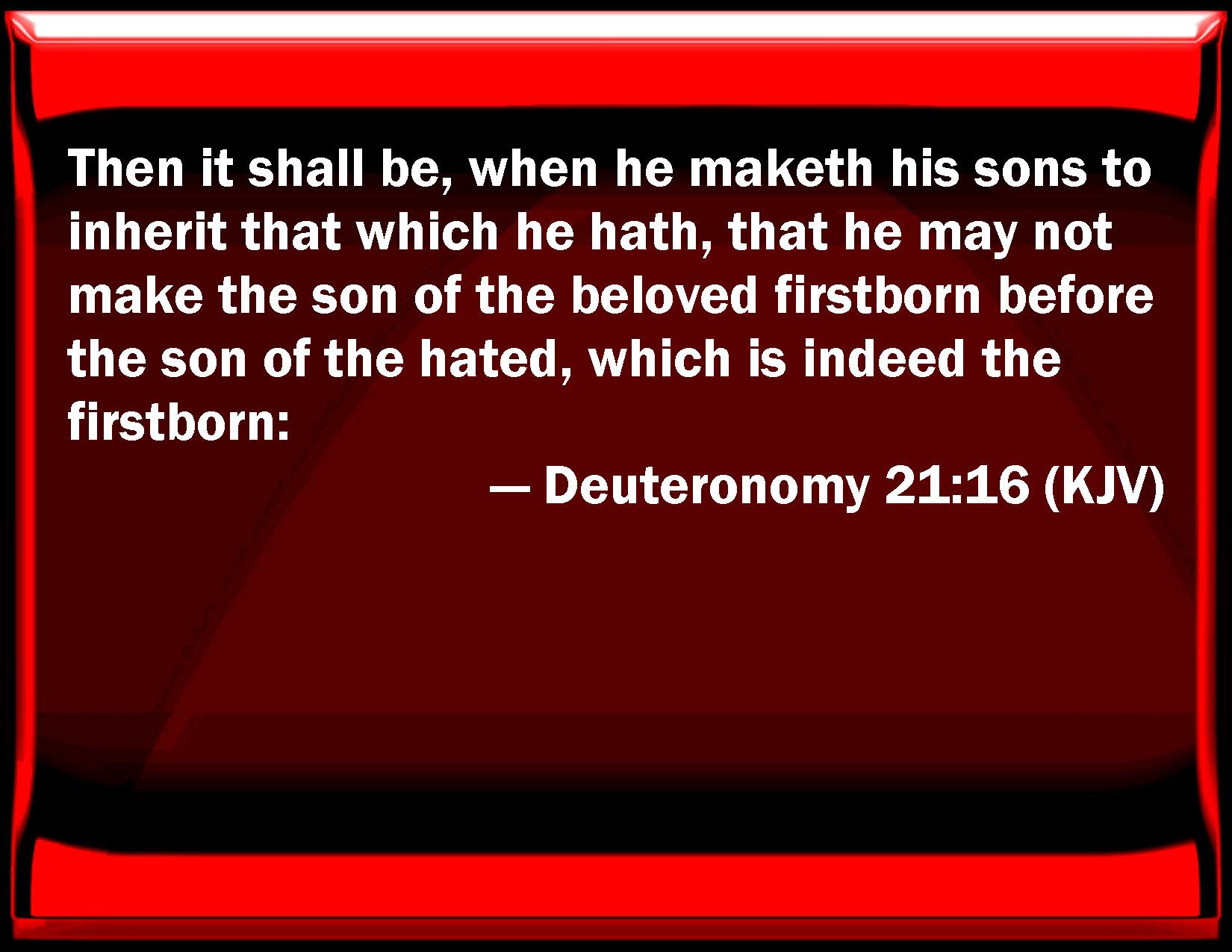 Bible Verse Slide Deuteronomy 21:16 Then it shall be, when he makes his sons to inherit that which he has, that he may not make the son of the beloved firstborn before the son of the hated, which is indeed the firstborn: KJV: Then it shall be, when he maketh his sons to inherit that which he hath, that he may not make the son of the beloved firstborn before the son of the hated, which is indeed the firstborn: DRB: And he meaneth to divide his substance among his sons: he may not make the son of the beloved the firstborn, and prefer him before the son of the hated. DBT: then it shall be, in the day that he maketh his sons to inherit what he hath, that he may not make the son of the beloved firstborn before the son of the hated, who is the firstborn; ERV: then it shall be, in the day that he causeth his sons to inherit that which he hath, that he may not make the son of the beloved the firstborn before the son of the hated, which is the firstborn: WBT: Then it shall be, when he maketh his sons to inherit that which he hath, that he may not prefer the son of the beloved first-born, before the son of the hated, which is indeed the first-born: WEB: then it shall be, in the day that he causes his sons to inherit that which he has, that he may not make the son of the beloved the firstborn before the son of the hated, who is the firstborn: YLT: then it hath been, in the day of his causing his sons to inherit that which he hath, he is not able to declare first-born the son of the loved one, in the face of the son of the hated one — the first-born.Links Deuteronomy 21:16 NIV • Deuteronomy 21:16 NLT • Deuteronomy 21:16 ESV • Deuteronomy 21:16 NASB • Deuteronomy 21:16 KJV • Deuteronomy 21:16 Interlinear • Deuteronomy 21:16 Commentaries • Deuteronomy 21:16 Parallel Texts • Deuteronomy 21:16 Bible Apps • Deuteronomy 21:16 Parallel • Bible Hub |