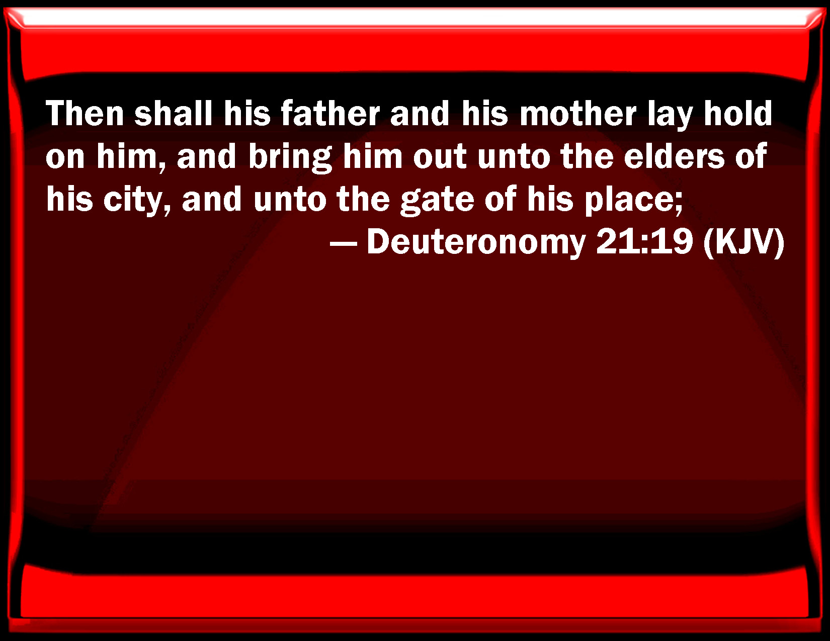 Bible Verse Slide Deuteronomy 21:19 Then shall his father and his mother lay hold on him, and bring him out to the elders of his city, and to the gate of his place; KJV: Then shall his father and his mother lay hold on him, and bring him out unto the elders of his city, and unto the gate of his place; DRB: They shall take him and bring him to the ancients of his city, and to the gate of judgment, DBT: then shall his father and his mother lay hold on him, and bring him out unto the elders of his city, and unto the gate of his place; ERV: then shall his father and his mother lay hold on him, and bring him out unto the elders of his city, and unto the gate of his place; WBT: Then shall his father and his mother lay hold on him, and bring him out to the elders of his city, and to the gate of his place; WEB: then shall his father and his mother lay hold on him, and bring him out to the elders of his city, and to the gate of his place; YLT: then laid hold on him have his father and his mother, and they have brought him out unto the elders of his city, and unto the gate of his place,Links Deuteronomy 21:19 NIV • Deuteronomy 21:19 NLT • Deuteronomy 21:19 ESV • Deuteronomy 21:19 NASB • Deuteronomy 21:19 KJV • Deuteronomy 21:19 Interlinear • Deuteronomy 21:19 Commentaries • Deuteronomy 21:19 Parallel Texts • Deuteronomy 21:19 Bible Apps • Deuteronomy 21:19 Parallel • Bible Hub |