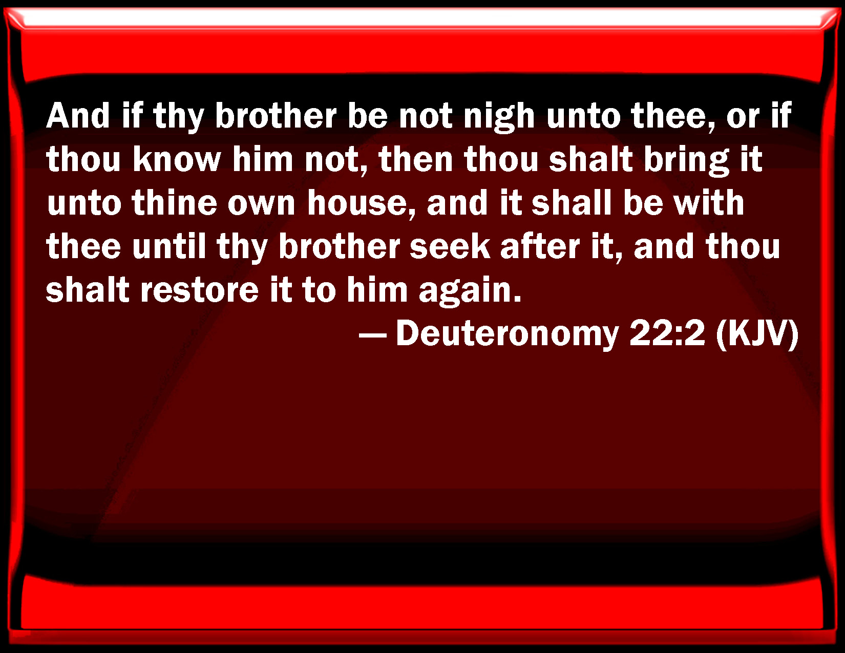 Bible Verse Slide Deuteronomy 22:2 And if your brother be not near to you, or if you know him not, then you shall bring it to your own house, and it shall be with you until your brother seek after it, and you shall restore it to him again. KJV: And if thy brother be not nigh unto thee, or if thou know him not, then thou shalt bring it unto thine own house, and it shall be with thee until thy brother seek after it, and thou shalt restore it to him again. DRB: And if thy brother be not nigh, or thou know him not: thou shalt bring them to thy house, and they shall be with thee until thy brother seek them, and receive them. DBT: And if thy brother be not near unto thee, and thou know him not, then thou shalt bring it unto thy house, and it shall be with thee until thy brother seek after it, and thou shalt restore it unto him. ERV: And if thy brother be not nigh unto thee, or if thou know him not, then thou shalt bring it home to thine house, and it shall be with thee until thy brother seek after it, and thou shalt restore it to him again. WBT: And if thy brother shall not be nigh to thee, or if thou shalt not know him, then thou shalt bring it to thy own house, and it shall be with thee until thy brother shall seek after it, and thou shalt restore it to him again. WEB: If your brother isn't near to you, or if you don't know him, then you shall bring it home to your house, and it shall be with you until your brother seek after it, and you shall restore it to him. YLT: and if thy brother is not near unto thee, and thou hast not known him, then thou hast removed it unto the midst of thy house, and it hath been with thee till thy brother seek it, and thou hast given it back to him;Links Deuteronomy 22:2 NIV • Deuteronomy 22:2 NLT • Deuteronomy 22:2 ESV • Deuteronomy 22:2 NASB • Deuteronomy 22:2 KJV • Deuteronomy 22:2 Interlinear • Deuteronomy 22:2 Commentaries • Deuteronomy 22:2 Parallel Texts • Deuteronomy 22:2 Bible Apps • Deuteronomy 22:2 Parallel • Bible Hub |