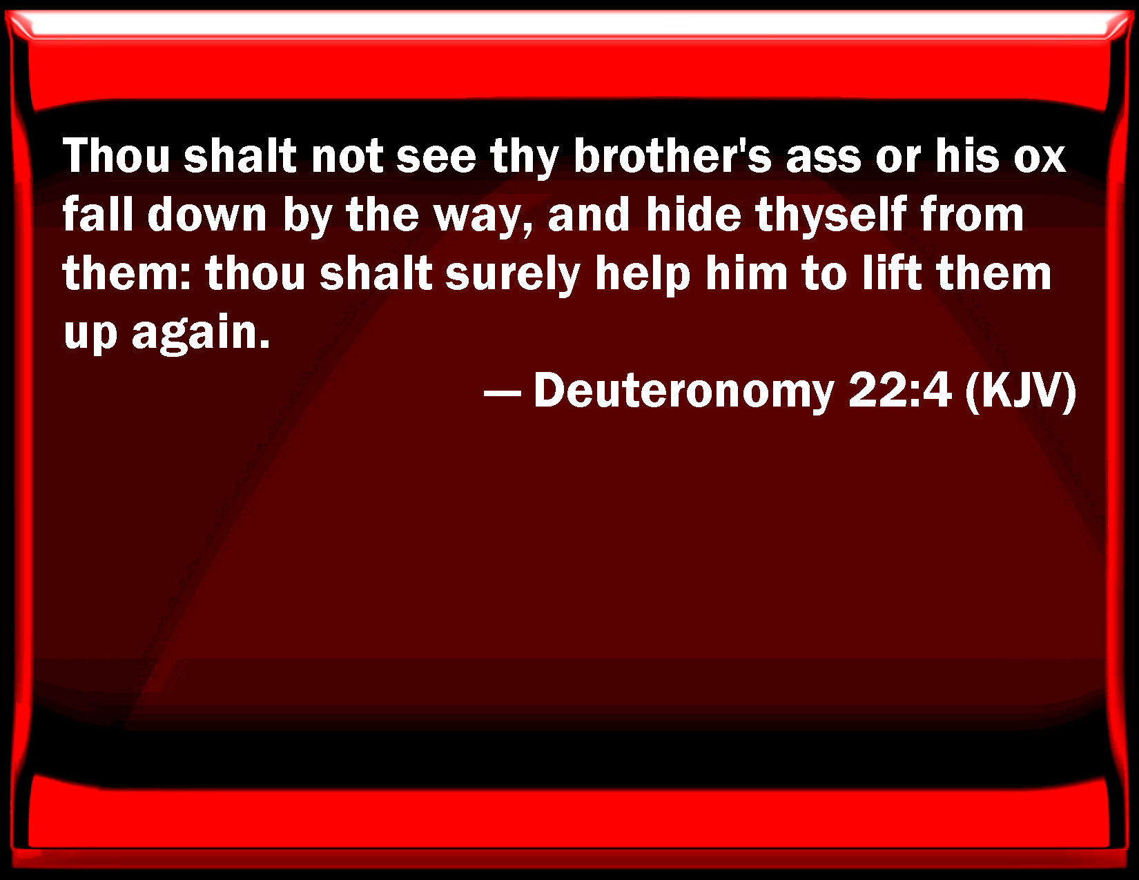 Bible Verse Slide Deuteronomy 22:4 You shall not see your brother's ass or his ox fall down by the way, and hide yourself from them: you shall surely help him to lift them up again. KJV: Thou shalt not see thy brother's ass or his ox fall down by the way, and hide thyself from them: thou shalt surely help him to lift them up again. DRB: If thou see thy brother's ass or his ox to be fallen down in the way, thou shalt not slight it, but shalt lift it up with him. DBT: Thou shalt not see thy brother's ass or his ox fall by the way, and hide thyself from them: thou shalt in any case help him to lift them up. ERV: Thou shalt not see thy brother's ass or his ox fallen down by the way, and hide thyself from them: thou shalt surely help him to lift them up again. WBT: Thou shalt not see thy brother's ass or his ox fall down by the way, and hide thyself from them: thou shalt surely help him to lift them up again. WEB: You shall not see your brother's donkey or his ox fallen down by the way, and hide yourself from them: you shall surely help him to lift them up again. YLT: Thou dost not see the ass of thy brother, or his ox, falling in the way, and hast hid thyself from them; thou dost certainly raise them up with him.Links Deuteronomy 22:4 NIV • Deuteronomy 22:4 NLT • Deuteronomy 22:4 ESV • Deuteronomy 22:4 NASB • Deuteronomy 22:4 KJV • Deuteronomy 22:4 Interlinear • Deuteronomy 22:4 Commentaries • Deuteronomy 22:4 Parallel Texts • Deuteronomy 22:4 Bible Apps • Deuteronomy 22:4 Parallel • Bible Hub |