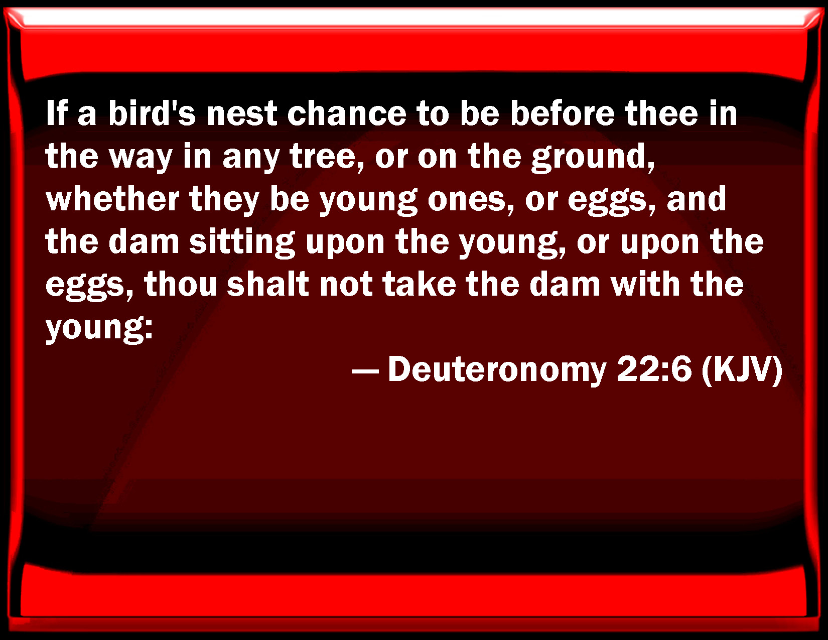 KJV:  If a bird's nest chance to be before thee in the way in any tree, or on the ground, whether they be young ones, or eggs, and the dam sitting upon the young, or upon the eggs, thou shalt not take the dam with the young: