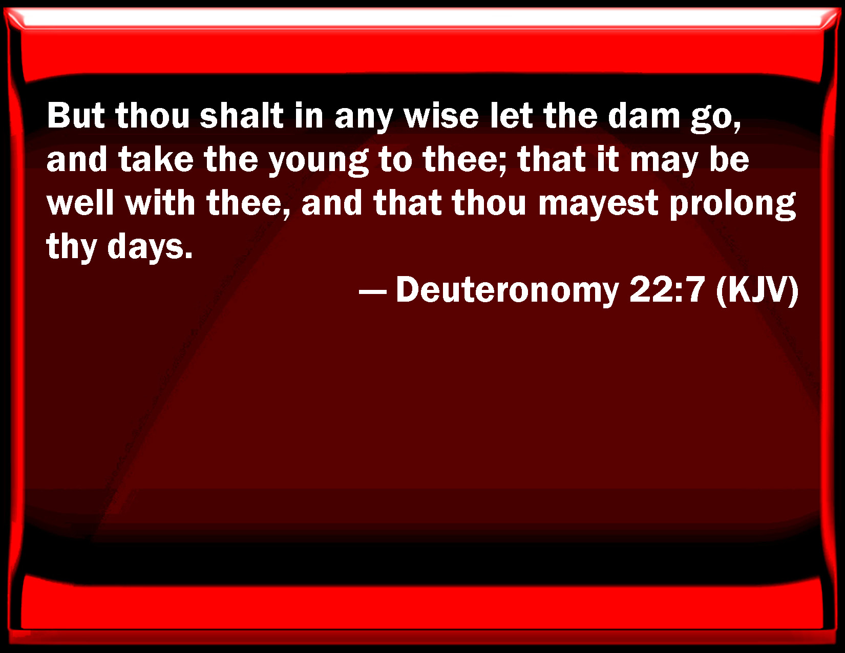 Bible Verse Slide Deuteronomy 22:7 But you shall in any wise let the dam go, and take the young to you; that it may be well with you, and that you may prolong your days. KJV: But thou shalt in any wise let the dam go, and take the young to thee; that it may be well with thee, and that thou mayest prolong thy days. DRB: But shalt let her go, keeping the young which thou hast caught: that it may be well with thee, and thou mayst live a long time. DBT: thou shalt in any case let the dam go, and thou mayest take the young to thee, that it may be well with thee, and that thou mayest prolong thy days. ERV: thou shalt in any wise let the dam go, but the young thou mayest take unto thyself; that it may be well with thee, and that thou mayest prolong thy days. WBT: But thou shalt in any wise let the dam go, and take the young to thee; that it may be well with thee, and that thou mayest prolong thy days. WEB: you shall surely let the hen go, but the young you may take to yourself; that it may be well with you, and that you may prolong your days. YLT: thou dost certainly send away the mother, and the young ones dost take to thyself, so that it is well with thee, and thou hast prolonged days.Links Deuteronomy 22:7 NIV • Deuteronomy 22:7 NLT • Deuteronomy 22:7 ESV • Deuteronomy 22:7 NASB • Deuteronomy 22:7 KJV • Deuteronomy 22:7 Interlinear • Deuteronomy 22:7 Commentaries • Deuteronomy 22:7 Parallel Texts • Deuteronomy 22:7 Bible Apps • Deuteronomy 22:7 Parallel • Bible Hub |