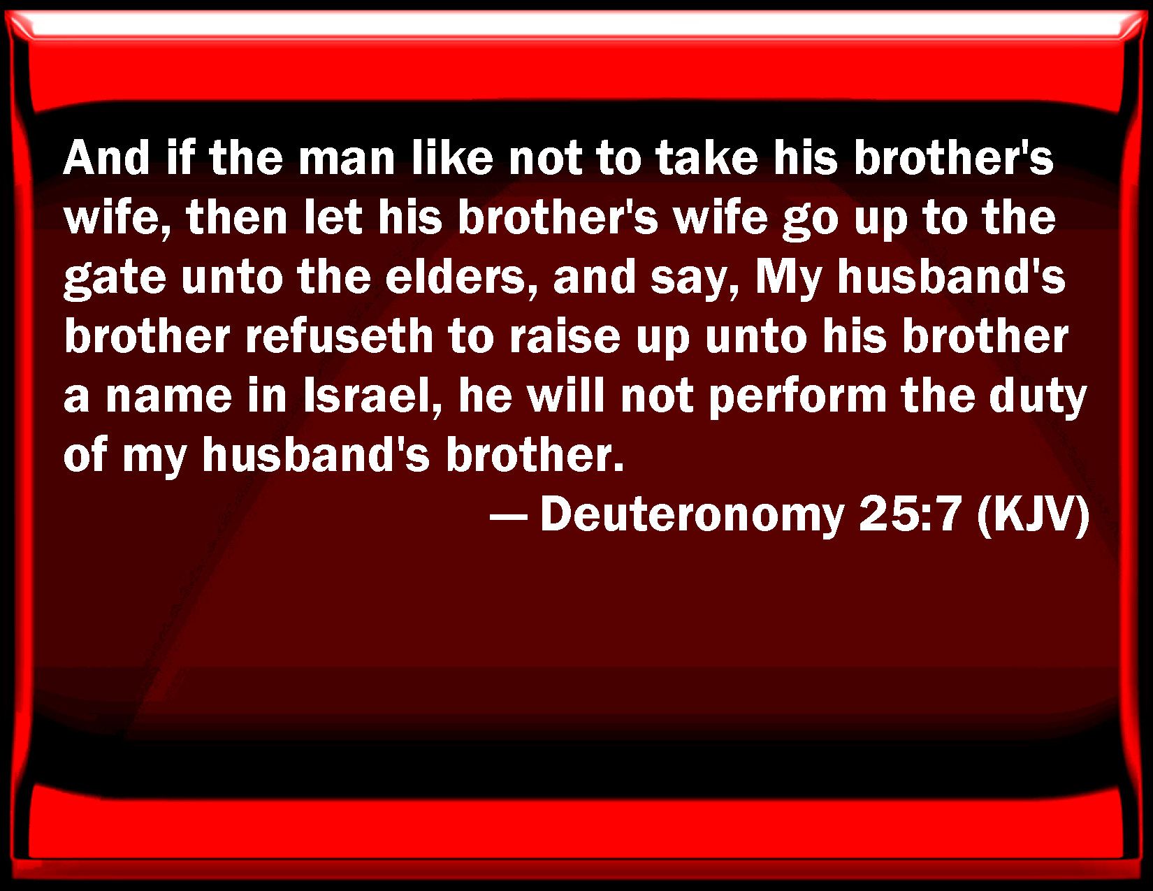 Bible Verse Slide Deuteronomy 25:7 And if the man like not to take his brother's wife, then let his brother's wife go up to the gate to the elders, and say, My husband's brother refuses to raise up to his brother a name in Israel, he will not perform the duty of my husband's brother. KJV: And if the man like not to take his brother's wife, then let his brother's wife go up to the gate unto the elders, and say, My husband's brother refuseth to raise up unto his brother a name in Israel, he will not perform the duty of my husband's brother. DRB: But if he will not take his brother's wife, who by law belongeth to him, the woman shall go to the gate of the city, and call upon the ancients, and say: My husband's brother refuseth to raise up his brother's name in Israel: and will not take me to wife. DBT: But if the man like not to take his brother's wife, his brother's wife shall go up to the gate unto the elders, and say, My husband's brother refuseth to raise up unto his brother a name in Israel: he will not perform for me the duty of a husband's brother. ERV: And if the man like not to take his brother's wife, then his brother's wife shall go up to the gate unto the elders, and say, My husband's brother refuseth to raise up unto his brother a name in Israel, he will not perform the duty of an husband's brother unto me. WBT: And if the man shall not like to take his brother's wife, then let his brother's wife go up to the gate to the elders, and say, My husband's brother refuseth to raise up to his brother a name in Israel, he will not perform the duty of my husband's brother. WEB: If the man doesn't want to take his brother's wife, then his brother's wife shall go up to the gate to the elders, and say, "My husband's brother refuses to raise up to his brother a name in Israel; he will not perform the duty of a husband's brother to me." YLT: 'And if the man doth not delight to take his brother's wife, then hath his brother's wife gone up to the gate, unto the elders, and said, My husband's brother is refusing to raise up to his brother a name in Israel; he hath not been willing to perform the duty of my husband's brother;Links Deuteronomy 25:7 NIV • Deuteronomy 25:7 NLT • Deuteronomy 25:7 ESV • Deuteronomy 25:7 NASB • Deuteronomy 25:7 KJV • Deuteronomy 25:7 Interlinear • Deuteronomy 25:7 Commentaries • Deuteronomy 25:7 Parallel Texts • Deuteronomy 25:7 Bible Apps • Deuteronomy 25:7 Parallel • Bible Hub |