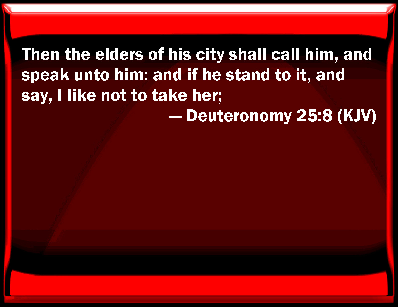 Bible Verse Slide Deuteronomy 25:8 Then the elders of his city shall call him, and speak to him: and if he stand to it, and say, I like not to take her; KJV: Then the elders of his city shall call him, and speak unto him: and if he stand to it, and say, I like not to take her; DRB: And they shall cause him to be sent for forthwith, and shall ask him. If he answer: I will not take her to wife: DBT: Then the elders of his city shall call him and speak unto him; and if he stand to it and say, I like not to take her; ERV: Then the elders of his city shall call him, and speak unto him: and if he stand, and say, I like not to take her; WBT: Then the elders of his city shall call him, and speak to him: and if he shall stand to it, and say, I like not to take her, WEB: Then the elders of his city shall call him, and speak to him: and if he stand, and say, "I don't want to take her;" YLT: and the elders of his city have called for him, and spoken unto him, and he hath stood and said, I have no desire to take her;Links Deuteronomy 25:8 NIV • Deuteronomy 25:8 NLT • Deuteronomy 25:8 ESV • Deuteronomy 25:8 NASB • Deuteronomy 25:8 KJV • Deuteronomy 25:8 Interlinear • Deuteronomy 25:8 Commentaries • Deuteronomy 25:8 Parallel Texts • Deuteronomy 25:8 Bible Apps • Deuteronomy 25:8 Parallel • Bible Hub |