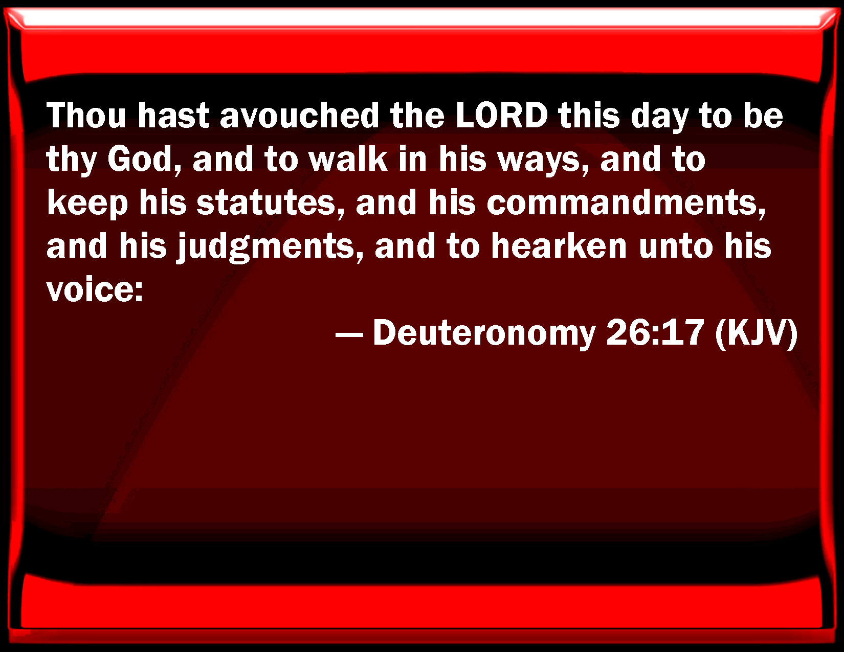 Bible Verse Slide Deuteronomy 26:17 You have avouched the LORD this day to be your God, and to walk in his ways, and to keep his statutes, and his commandments, and his judgments, and to listen to his voice: KJV: Thou hast avouched the LORD this day to be thy God, and to walk in his ways, and to keep his statutes, and his commandments, and his judgments, and to hearken unto his voice: DRB: Thou hast chosen the Lord this day to be thy God, and to walk in his ways and keep his ceremonies, and precepts, end judgments, and obey his command. DBT: Thou hast this day accepted Jehovah to be thy God, and to walk in his ways, and keep his statutes, and his commandments, and his ordinances, and to hearken unto his voice; ERV: Thou hast avouched the LORD this day to be thy God, and that thou shouldest walk in his ways, and keep his statutes, and his commandments, and his judgments, and hearken unto his voice: WBT: Thou hast avouched the LORD this day to be thy God, and to walk in his ways, and to keep his statutes, and his commandments, and his judgments, and to hearken to his voice: WEB: You have declared Yahweh this day to be your God, and that you would walk in his ways, and keep his statutes, and his commandments, and his ordinances, and listen to his voice: YLT: Jehovah thou hast caused to promise to-day to become thy God, and to walk in His ways, and to keep His statutes, and His commands, and His judgments, and to hearken to His voice.Links Deuteronomy 26:17 NIV • Deuteronomy 26:17 NLT • Deuteronomy 26:17 ESV • Deuteronomy 26:17 NASB • Deuteronomy 26:17 KJV • Deuteronomy 26:17 Interlinear • Deuteronomy 26:17 Commentaries • Deuteronomy 26:17 Parallel Texts • Deuteronomy 26:17 Bible Apps • Deuteronomy 26:17 Parallel • Bible Hub |