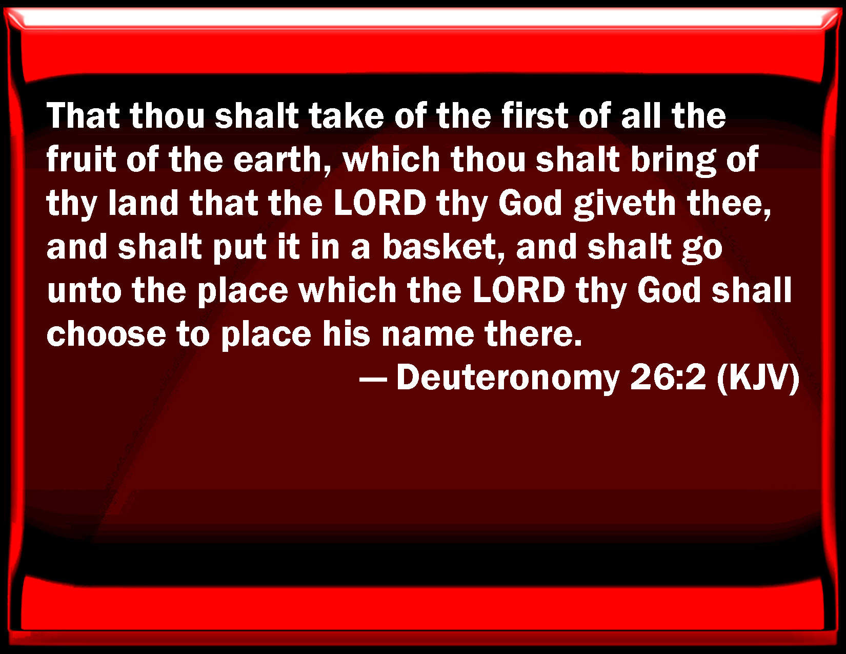 Bible Verse Slide Deuteronomy 26:2 That you shall take of the first of all the fruit of the earth, which you shall bring of your land that the LORD your God gives you, and shall put it in a basket, and shall go to the place which the LORD your God shall choose to place his name there. KJV: That thou shalt take of the first of all the fruit of the earth, which thou shalt bring of thy land that the LORD thy God giveth thee, and shalt put it in a basket, and shalt go unto the place which the LORD thy God shall choose to place his name there. DRB: Thou shalt take the first of all thy fruits, and put then? in a basket, and shalt go to the place which the Lord thy God shall choose, that his name may be invocated there: DBT: that thou shalt take of the first of all the fruit of the ground, which thou shalt bring of thy land which Jehovah thy God giveth thee, and shalt put it in a basket, and shalt go unto the place that Jehovah thy God will choose to cause his name to dwell there; ERV: that thou shalt take of the first of all the fruit of the ground, which thou shalt bring in from thy land that the LORD thy God giveth thee; and thou shalt put it in a basket, and shalt go unto the place which the LORD thy God shall choose to cause his name to dwell there. WBT: That thou shalt take of the first of all the fruit of the earth, which thou shalt bring of thy land that the LORD thy God giveth thee, and shalt put it in a basket, and shalt go to the place which the LORD thy God shall choose to place his name there. WEB: that you shall take of the first of all the fruit of the ground, which you shall bring in from your land that Yahweh your God gives you; and you shall put it in a basket, and shall go to the place which Yahweh your God shall choose, to cause his name to dwell there. YLT: that thou hast taken of the first of all the fruits of the ground which thou dost bring in out of thy land which Jehovah thy God is giving to thee, and hast put it in a basket, and gone unto the place which Jehovah thy God doth choose to cause His name to tabernacle there.Links Deuteronomy 26:2 NIV • Deuteronomy 26:2 NLT • Deuteronomy 26:2 ESV • Deuteronomy 26:2 NASB • Deuteronomy 26:2 KJV • Deuteronomy 26:2 Interlinear • Deuteronomy 26:2 Commentaries • Deuteronomy 26:2 Parallel Texts • Deuteronomy 26:2 Bible Apps • Deuteronomy 26:2 Parallel • Bible Hub |