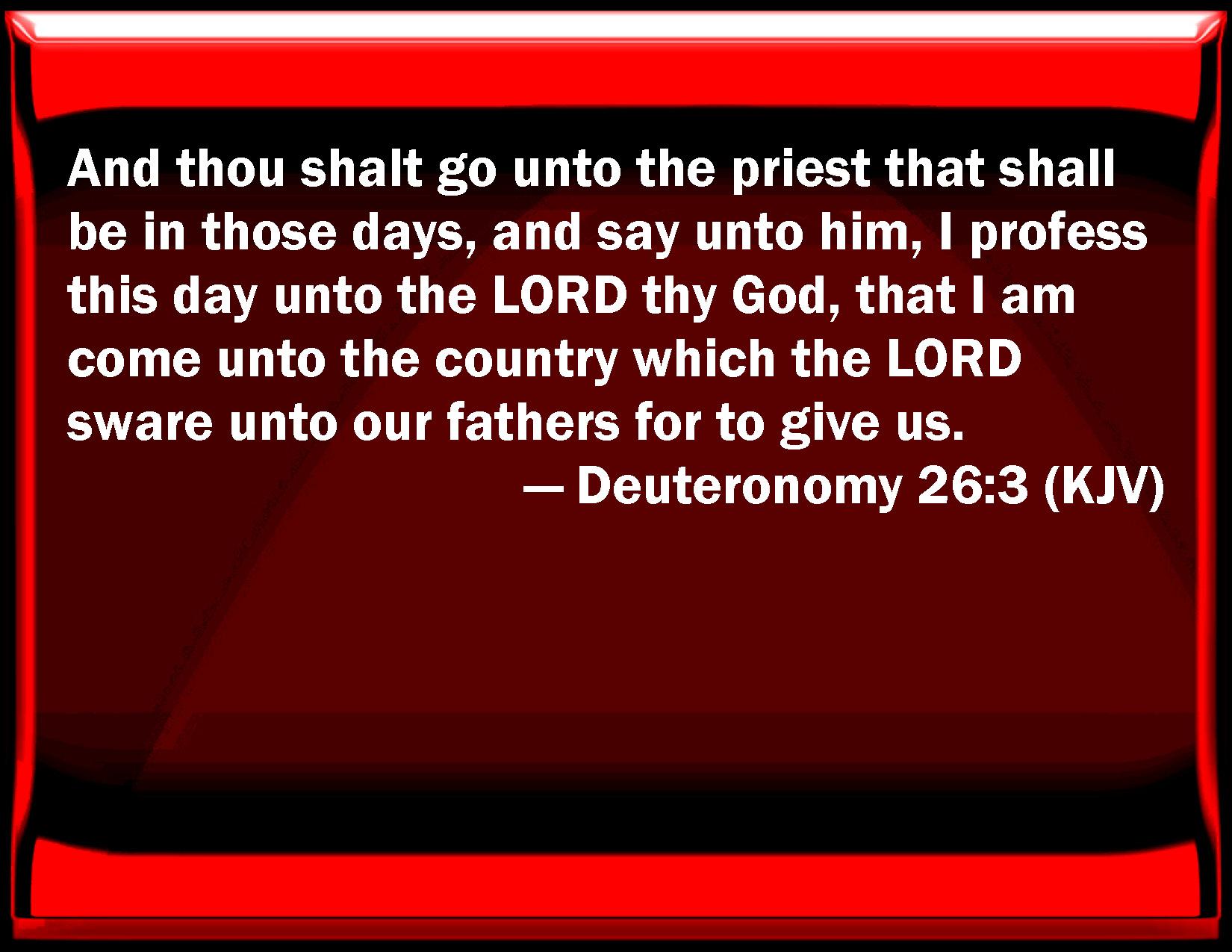 Bible Verse Slide Deuteronomy 26:3 And you shall go to the priest that shall be in those days, and say to him, I profess this day to the LORD your God, that I am come to the country which the LORD swore to our fathers for to give us. KJV: And thou shalt go unto the priest that shall be in those days, and say unto him, I profess this day unto the LORD thy God, that I am come unto the country which the LORD sware unto our fathers for to give us. DRB: And thou shalt go to the priest that shall be in those days, and say to him: I profess this day before the Lord thy God, that I am come into the land, for which he swore to our fathers, that he would give it us. DBT: and thou shalt come unto the priest that shall be in those days, and say unto him, I profess this day unto Jehovah thy God, that I am come unto the land that Jehovah swore unto our fathers to give us. ERV: And thou shalt come unto the priest that shall be in those days, and say unto him, I profess this day unto the LORD thy God, that I am come unto the land which the LORD sware unto our fathers for to give us. WBT: And thou shalt go to the priest that shall be in those days, and say to him, I profess this day to the LORD thy God, that I have come to the country which the LORD swore to our fathers to give us. WEB: You shall come to the priest who shall be in those days, and tell him, "I profess this day to Yahweh your God, that I am come to the land which Yahweh swore to our fathers to give us." YLT: 'And thou hast come in unto the priest who is in those days, and hast said unto him, I have declared to-day to Jehovah thy God, that I have come in unto the land which Jehovah hath sworn to our fathers to give to us;Links Deuteronomy 26:3 NIV • Deuteronomy 26:3 NLT • Deuteronomy 26:3 ESV • Deuteronomy 26:3 NASB • Deuteronomy 26:3 KJV • Deuteronomy 26:3 Interlinear • Deuteronomy 26:3 Commentaries • Deuteronomy 26:3 Parallel Texts • Deuteronomy 26:3 Bible Apps • Deuteronomy 26:3 Parallel • Bible Hub |