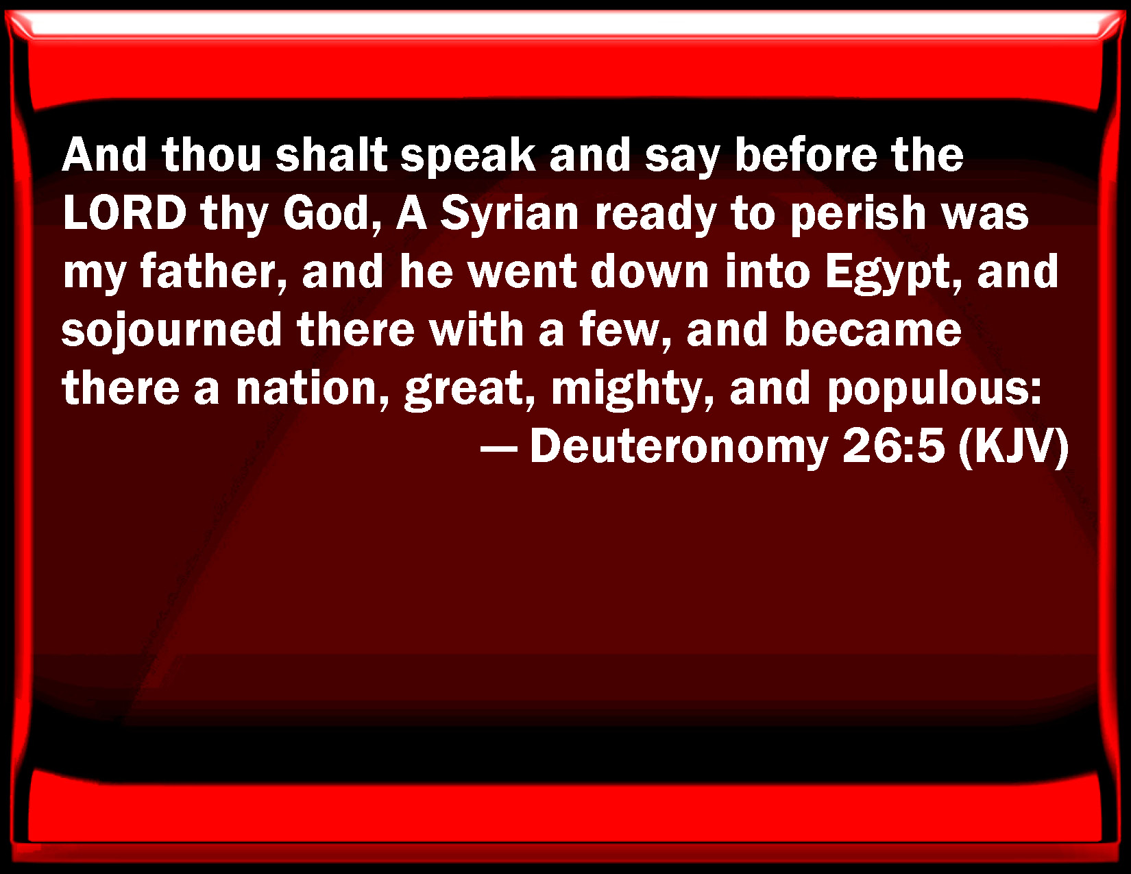 Bible Verse Slide Deuteronomy 26:5 And you shall speak and say before the LORD your God, A Syrian ready to perish was my father, and he went down into Egypt, and sojourned there with a few, and became there a nation, great, mighty, and populous: KJV: And thou shalt speak and say before the LORD thy God, A Syrian ready to perish was my father, and he went down into Egypt, and sojourned there with a few, and became there a nation, great, mighty, and populous: DRB: And thou shalt speak thus in the sight of the Lord thy God: The Syrian pursued my father, who went down into Egypt, and sojourned there in a very small number, and grew into a nation great and strong and of an infinite multitude. DBT: And thou shalt speak and say before Jehovah thy God, A perishing Aramean was my father, and he went down to Egypt with a few, and sojourned there, and became there a nation, great, mighty, and populous. ERV: And thou shalt answer and say before the LORD thy God, A Syrian ready to perish was my father, and he went down into Egypt, and sojourned there, few in number; and he became there a nation, great, mighty, and populous: WBT: And thou shalt speak and say before the LORD thy God, A Syrian ready to perish was my father, and he went down to Egypt, and sojourned there with a few, and became there a nation, great, mighty, and populous: WEB: You shall answer and say before Yahweh your God, "A Syrian ready to perish was my father; and he went down into Egypt, and lived there, few in number; and he became there a nation, great, mighty, and populous. YLT: And thou hast answered and said before Jehovah thy God, A perishing Aramaean is my father! and he goeth down to Egypt, and sojourneth there with few men, and becometh there a nation, great, mighty, and numerous;Links Deuteronomy 26:5 NIV • Deuteronomy 26:5 NLT • Deuteronomy 26:5 ESV • Deuteronomy 26:5 NASB • Deuteronomy 26:5 KJV • Deuteronomy 26:5 Interlinear • Deuteronomy 26:5 Commentaries • Deuteronomy 26:5 Parallel Texts • Deuteronomy 26:5 Bible Apps • Deuteronomy 26:5 Parallel • Bible Hub |