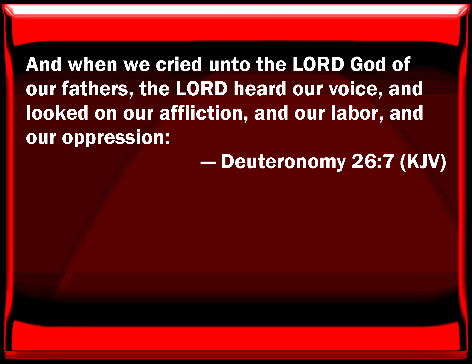 Bible Verse Slide Deuteronomy 26:7 And when we cried to the LORD God of our fathers, the LORD heard our voice, and looked on our affliction, and our labor, and our oppression: KJV: And when we cried unto the LORD God of our fathers, the LORD heard our voice, and looked on our affliction, and our labour, and our oppression: DRB: And we cried to the Lord God of our fathers: who heard us, and looked down upon our affliction, and labour, and distress: DBT: and we cried to Jehovah, the God of our fathers, and Jehovah heard our voice, and looked on our affliction, and our labour, and our oppression; ERV: and we cried unto the LORD, the God of our fathers, and the LORD heard our voice, and saw our affliction, and our toil, and our oppression: WBT: And when we cried to the LORD God of our fathers, the LORD heard our voice, and looked on our affliction, and our labor, and our oppression: WEB: and we cried to Yahweh, the God of our fathers, and Yahweh heard our voice, and saw our affliction, and our toil, and our oppression; YLT: and we cry unto Jehovah, God of our fathers, and Jehovah heareth our voice, and seeth our affliction, and our labour, and our oppression;Links Deuteronomy 26:7 NIV • Deuteronomy 26:7 NLT • Deuteronomy 26:7 ESV • Deuteronomy 26:7 NASB • Deuteronomy 26:7 KJV • Deuteronomy 26:7 Interlinear • Deuteronomy 26:7 Commentaries • Deuteronomy 26:7 Parallel Texts • Deuteronomy 26:7 Bible Apps • Deuteronomy 26:7 Parallel • Bible Hub |