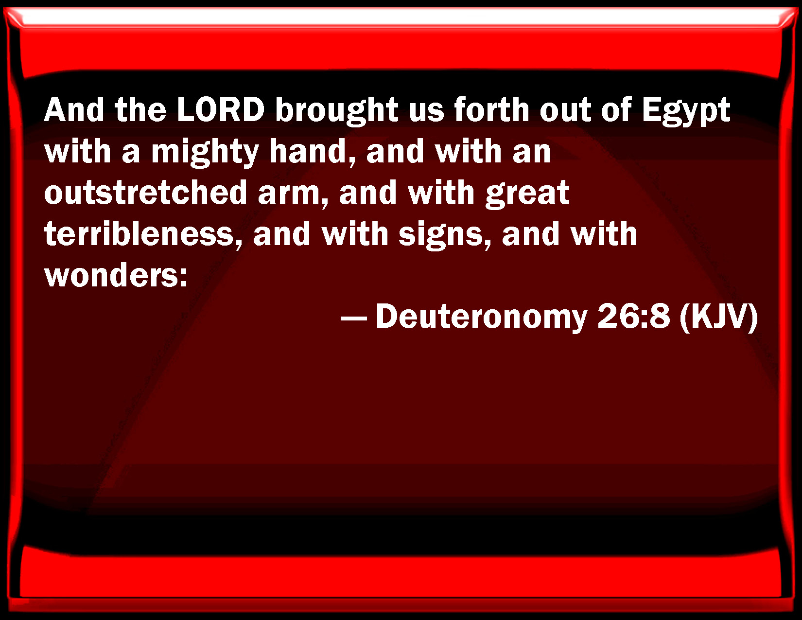 Bible Verse Slide Deuteronomy 26:8 And the LORD brought us forth out of Egypt with a mighty hand, and with an outstretched arm, and with great terribleness, and with signs, and with wonders: KJV: And the LORD brought us forth out of Egypt with a mighty hand, and with an outstretched arm, and with great terribleness, and with signs, and with wonders: DRB: And brought us out of Egypt with a strong hand, and a stretched out arm, with great terror, with signs and wonders: DBT: and Jehovah brought us forth out of Egypt with a powerful hand, and with a stretched-out arm, and with great terribleness, and with signs, and with wonders; ERV: and the LORD brought us forth out of Egypt with a mighty hand, and with an outstretched arm, and with great terribleness, and with signs, and with wonders: WBT: And the LORD brought us out of Egypt with a mighty hand, and with an out-stretched arm, and with great terribleness, and with signs, and with wonders; WEB: and Yahweh brought us forth out of Egypt with a mighty hand, and with an outstretched arm, and with great terror, and with signs, and with wonders; YLT: and Jehovah bringeth us out from Egypt, by a strong hand, and by a stretched-out arm, and by great fear, and by signs, and by wonders,Links Deuteronomy 26:8 NIV • Deuteronomy 26:8 NLT • Deuteronomy 26:8 ESV • Deuteronomy 26:8 NASB • Deuteronomy 26:8 KJV • Deuteronomy 26:8 Interlinear • Deuteronomy 26:8 Commentaries • Deuteronomy 26:8 Parallel Texts • Deuteronomy 26:8 Bible Apps • Deuteronomy 26:8 Parallel • Bible Hub |