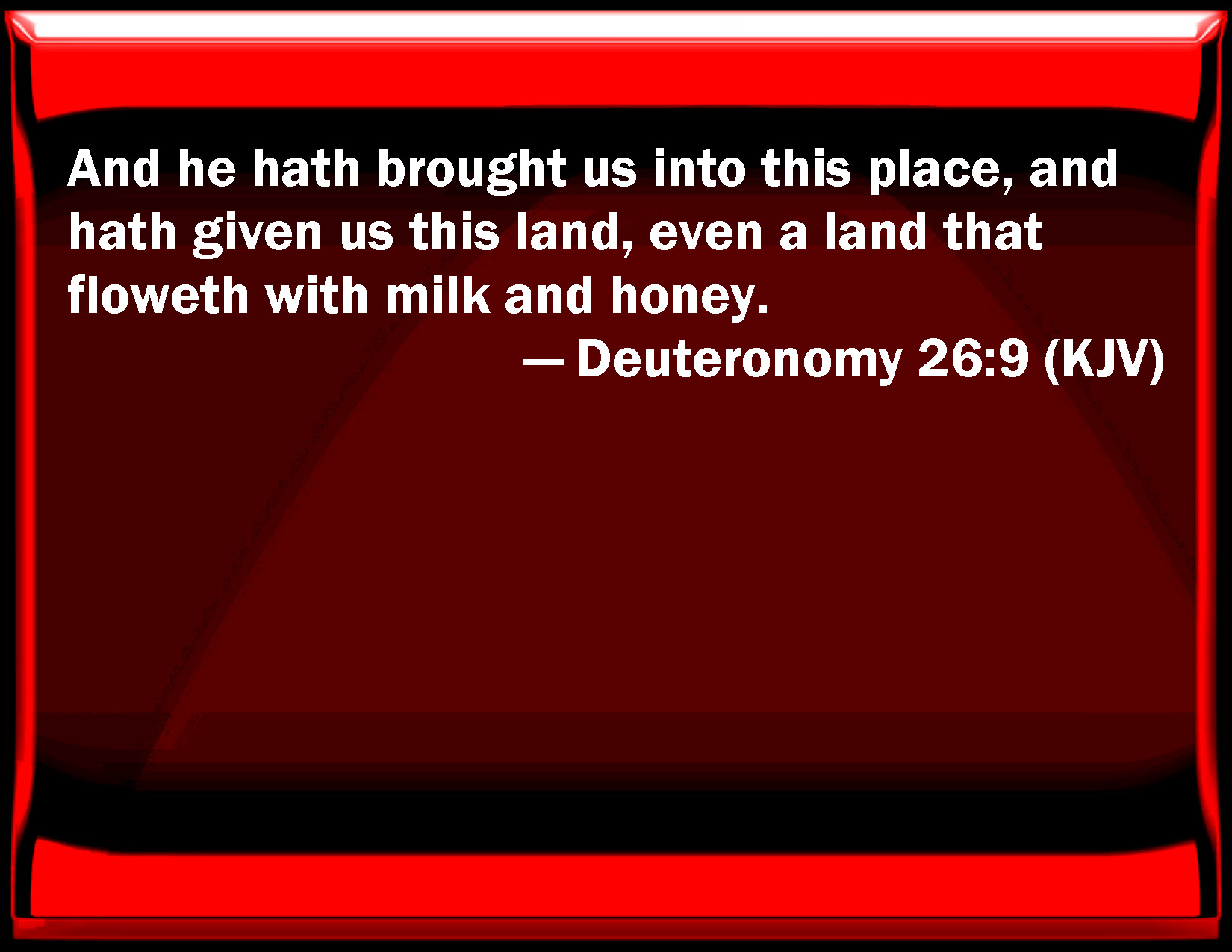 Bible Verse Slide Deuteronomy 26:9 And he has brought us into this place, and has given us this land, even a land that flows with milk and honey. KJV: And he hath brought us into this place, and hath given us this land, even a land that floweth with milk and honey. DRB: And brought us into this place, and gave us this land flowing with milk and honey. DBT: and he hath brought us into this place, and hath given us this land, a land flowing with milk and honey! ERV: and he hath brought us into this place, and hath given us this land, a land flowing with milk and honey. WBT: And he hath brought us into this place, and hath given us this land, even a land that floweth with milk and honey. WEB: and he has brought us into this place, and has given us this land, a land flowing with milk and honey. YLT: and he bringeth us in unto this place, and giveth to us this land — a land flowing with milk and honey.Links Deuteronomy 26:9 NIV • Deuteronomy 26:9 NLT • Deuteronomy 26:9 ESV • Deuteronomy 26:9 NASB • Deuteronomy 26:9 KJV • Deuteronomy 26:9 Interlinear • Deuteronomy 26:9 Commentaries • Deuteronomy 26:9 Parallel Texts • Deuteronomy 26:9 Bible Apps • Deuteronomy 26:9 Parallel • Bible Hub |