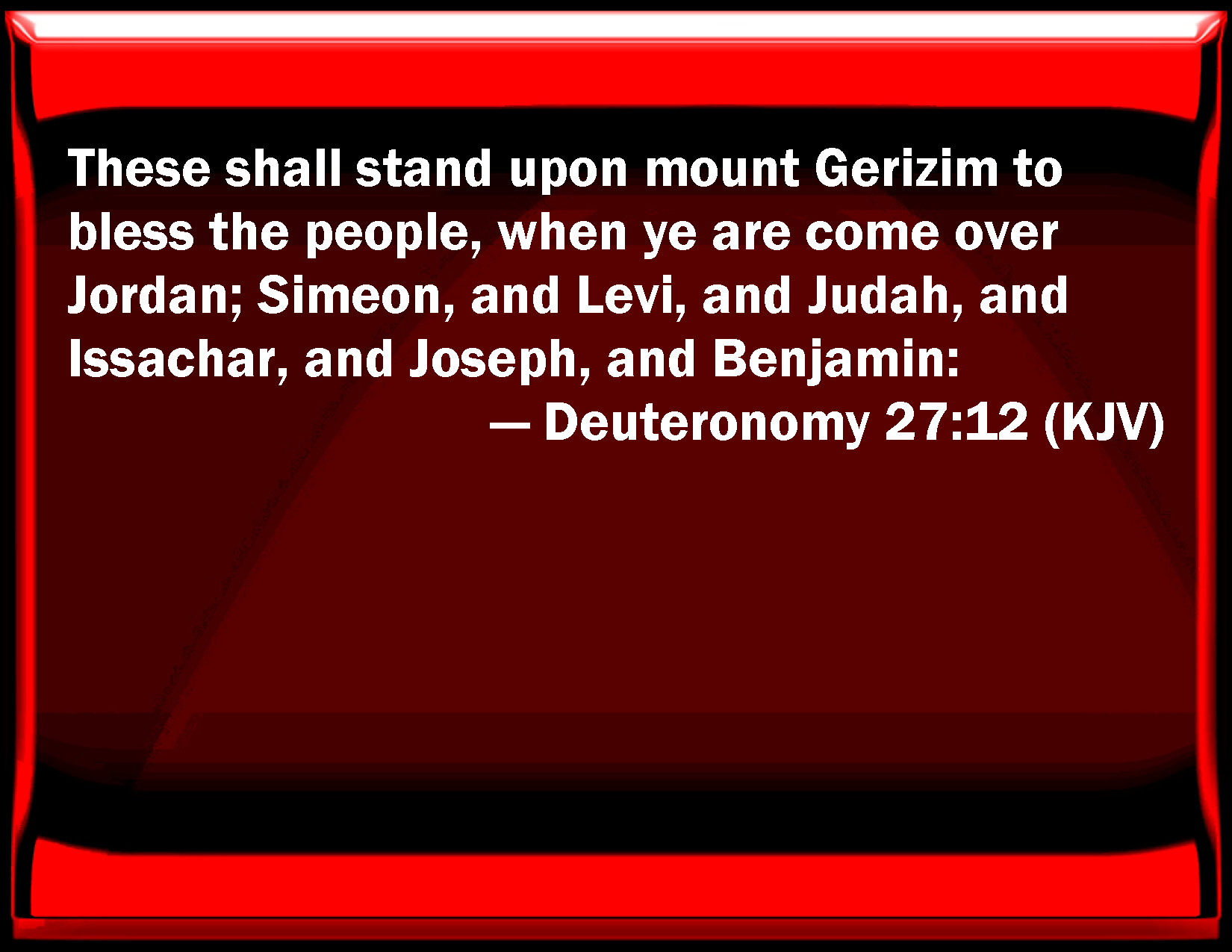 Bible Verse Slide Deuteronomy 27:12 These shall stand on mount Gerizim to bless the people, when you are come over Jordan; Simeon, and Levi, and Judah, and Issachar, and Joseph, and Benjamin: KJV: These shall stand upon mount Gerizim to bless the people, when ye are come over Jordan; Simeon, and Levi, and Judah, and Issachar, and Joseph, and Benjamin: DRB: These shall stand upon mount Garizim to bless the people, when you are passed the Jordan: Simeon, Levi, Juda, Issachar, Joseph, and Benjamin. DBT: These shall stand to bless the people upon mount Gerizim, when ye have gone over the Jordan: Simeon, and Levi, and Judah, and Issachar, and Joseph, and Benjamin. ERV: These shall stand upon mount Gerizim to bless the people, when ye are passed over Jordan; Simeon, and Levi, and Judah, and Issachar, and Joseph, and Benjamin: WBT: These shall stand upon mount Gerizim to bless the people, when ye have come over Jordan; Simeon, and Levi, and Judah, and Issachar, and Joseph, and Benjamin: WEB: "These shall stand on Mount Gerizim to bless the people, when you have passed over the Jordan: Simeon, and Levi, and Judah, and Issachar, and Joseph, and Benjamin. YLT: 'These do stand, to bless the people, on mount Gerizzim, in your passing over the Jordan: Simeon, and Levi, and Judah, and Issachar, and Joseph, and Benjamin.Links Deuteronomy 27:12 NIV • Deuteronomy 27:12 NLT • Deuteronomy 27:12 ESV • Deuteronomy 27:12 NASB • Deuteronomy 27:12 KJV • Deuteronomy 27:12 Interlinear • Deuteronomy 27:12 Commentaries • Deuteronomy 27:12 Parallel Texts • Deuteronomy 27:12 Bible Apps • Deuteronomy 27:12 Parallel • Bible Hub |