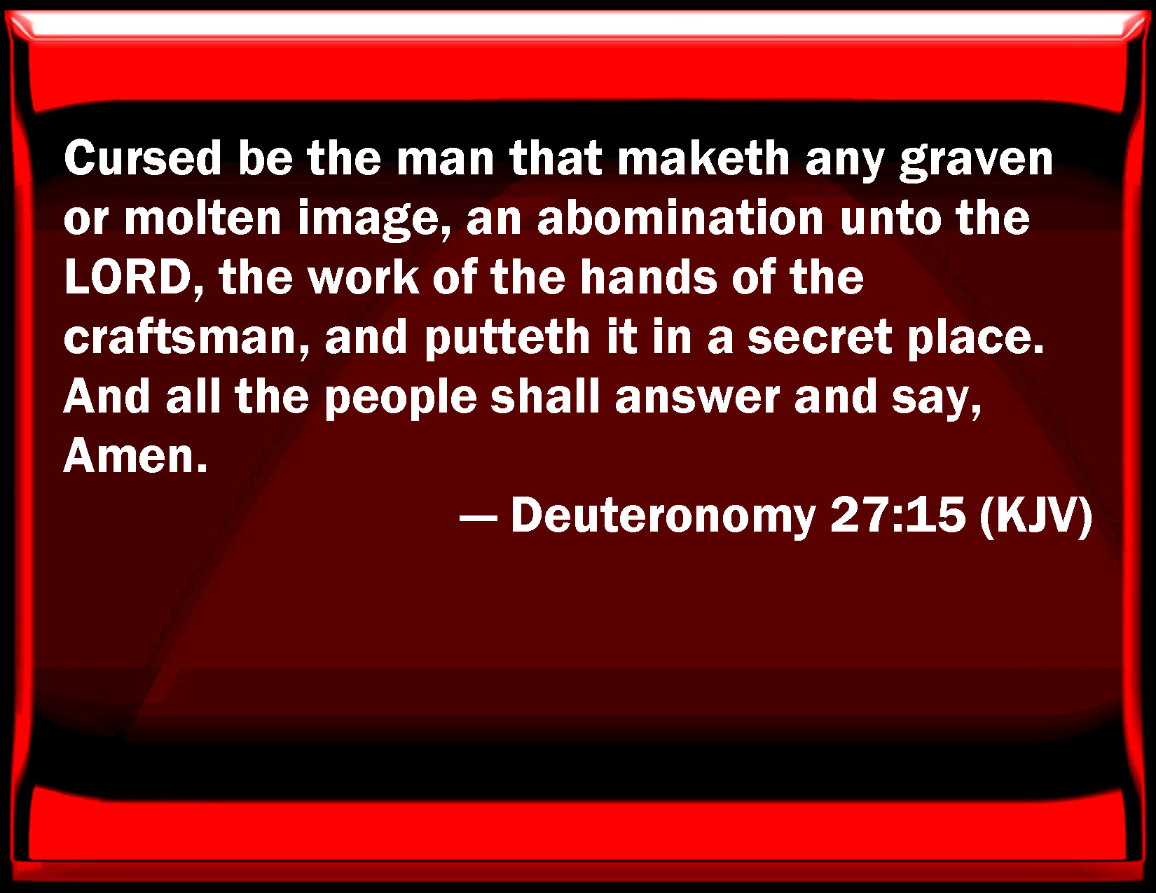Bible Verse Slide Deuteronomy 27:15 Cursed be the man that makes any graven or molten image, an abomination to the LORD, the work of the hands of the craftsman, and puts it in a secret place. And all the people shall answer and say, Amen. KJV: Cursed be the man that maketh any graven or molten image, an abomination unto the LORD, the work of the hands of the craftsman, and putteth it in a secret place. And all the people shall answer and say, Amen. DRB: Cursed be the man that maketh a graven and molten thing, the abomination of the Lord, the work of the hands of artificers, and shall put it in a secret place: and all the people shall answer and say: Amen. DBT: Cursed be the man that maketh a graven or molten image, an abomination to Jehovah, a work of the craftsman's hand, and putteth it up secretly! And all the people shall answer and say, Amen. ERV: Cursed be the man that maketh a graven or molten image, an abomination unto the LORD, the work of the hands of the craftsman, and setteth it up in secret. And all the people shall answer and say, Amen. WBT: Cursed be the man that maketh any graven or molten image, an abomination to the LORD, the work of the hands of the artificer, and putteth it in a secret place: and all the people shall answer, and say Amen. WEB: 'Cursed is the man who makes an engraved or molten image, an abomination to Yahweh, the work of the hands of the craftsman, and sets it up in secret.' All the people shall answer and say, 'Amen.' YLT: Cursed is the man who maketh a graven and molten image, the abomination of Jehovah, work of the hands of an artificer, and hath put it in a secret place, — and all the people have answered and said, Amen.Links Deuteronomy 27:15 NIV • Deuteronomy 27:15 NLT • Deuteronomy 27:15 ESV • Deuteronomy 27:15 NASB • Deuteronomy 27:15 KJV • Deuteronomy 27:15 Interlinear • Deuteronomy 27:15 Commentaries • Deuteronomy 27:15 Parallel Texts • Deuteronomy 27:15 Bible Apps • Deuteronomy 27:15 Parallel • Bible Hub |