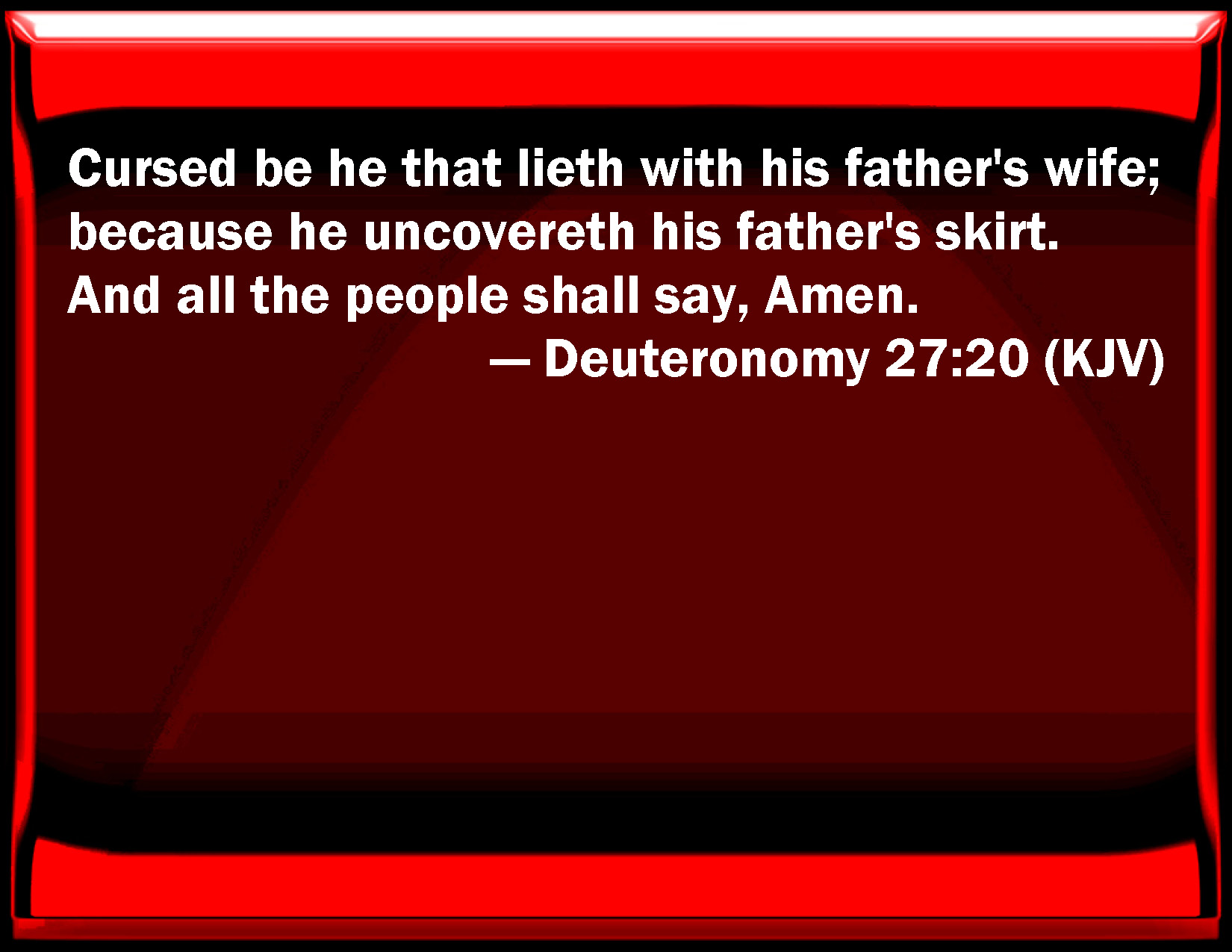 Bible Verse Slide Deuteronomy 27:20 Cursed be he that lies with his father's wife; because he uncovers his father's skirt. And all the people shall say, Amen. KJV: Cursed be he that lieth with his father's wife; because he uncovereth his father's skirt. And all the people shall say, Amen. DRB: Cursed be he that lieth with his father's wife, and uncovereth his bed: and all the people shall say: Amen. DBT: Cursed be he that lieth with his father's wife; for he uncovereth his father's skirt! And all the people shall say, Amen. ERV: Cursed be he that lieth with his father's wife; because he hath uncovered his father's skirt. And all the people shall say, Amen. WBT: Cursed be he that lieth with his father's wife; because he uncovereth his father's skirt: and all the people shall say, Amen. WEB: 'Cursed is he who lies with his father's wife, because he has uncovered his father's skirt.' All the people shall say, 'Amen.' YLT: Cursed is he who is lying with his father's wife, for he hath uncovered his father's skirt, — and all the people have said, Amen.Links Deuteronomy 27:20 NIV • Deuteronomy 27:20 NLT • Deuteronomy 27:20 ESV • Deuteronomy 27:20 NASB • Deuteronomy 27:20 KJV • Deuteronomy 27:20 Interlinear • Deuteronomy 27:20 Commentaries • Deuteronomy 27:20 Parallel Texts • Deuteronomy 27:20 Bible Apps • Deuteronomy 27:20 Parallel • Bible Hub |