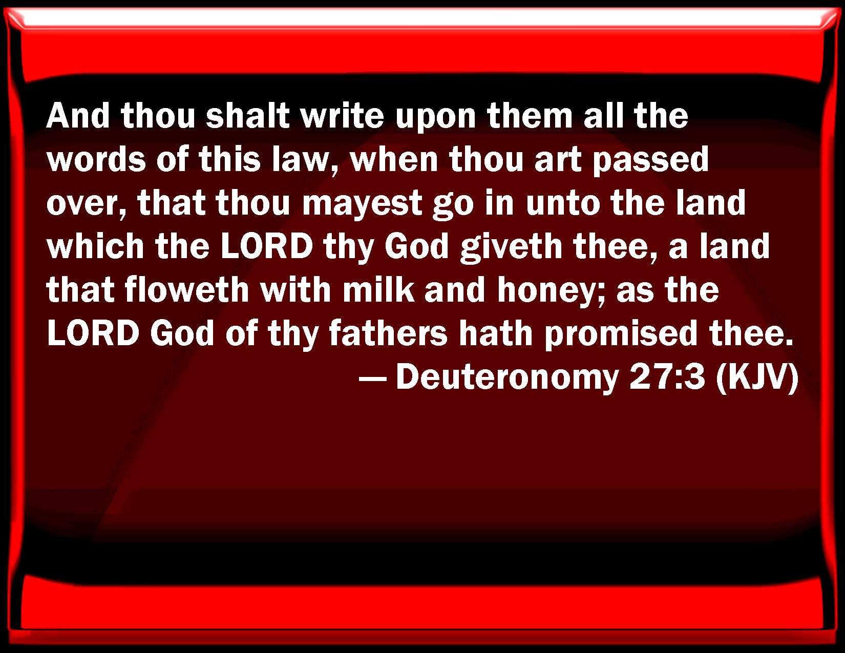 Bible Verse Slide Deuteronomy 27:3 And you shall write on them all the words of this law, when you are passed over, that you may go in to the land which the LORD your God gives you, a land that flows with milk and honey; as the LORD God of your fathers has promised you. KJV: And thou shalt write upon them all the words of this law, when thou art passed over, that thou mayest go in unto the land which the LORD thy God giveth thee, a land that floweth with milk and honey; as the LORD God of thy fathers hath promised thee. DRB: That thou mayst write on them all the words of this law, when thou art passed over the Jordan: that thou mayst enter into the land which the Lord thy God will give thee, a land flowing with milk and honey, as he swore to thy fathers. DBT: and thou shalt write upon them all the words of this law, when thou goest over that thou mayest enter into the land which Jehovah thy God giveth thee, a land flowing with milk and honey, as Jehovah the God of thy fathers hath promised thee. ERV: and thou shalt write upon them all the words of this law, when thou art passed over; that thou mayest go in unto the land which the LORD thy God giveth thee, a land flowing with milk and honey, as the LORD, the God of thy fathers, hath promised thee. WBT: And thou shalt write upon them all the words of this law, when thou hast passed over, that thou mayest enter in to the land which the LORD thy God giveth thee, a land that floweth with milk and honey; as the LORD God of thy fathers hath promised thee. WEB: and you shall write on them all the words of this law, when you have passed over; that you may go in to the land which Yahweh your God gives you, a land flowing with milk and honey, as Yahweh, the God of your fathers, has promised you. YLT: and written on them all the words of this law in thy passing over, so that thou goest in unto the land which Jehovah thy God is giving to thee — a land flowing with milk and honey, as Jehovah, God of thy fathers, hath spoken to thee.Links Deuteronomy 27:3 NIV • Deuteronomy 27:3 NLT • Deuteronomy 27:3 ESV • Deuteronomy 27:3 NASB • Deuteronomy 27:3 KJV • Deuteronomy 27:3 Interlinear • Deuteronomy 27:3 Commentaries • Deuteronomy 27:3 Parallel Texts • Deuteronomy 27:3 Bible Apps • Deuteronomy 27:3 Parallel • Bible Hub |