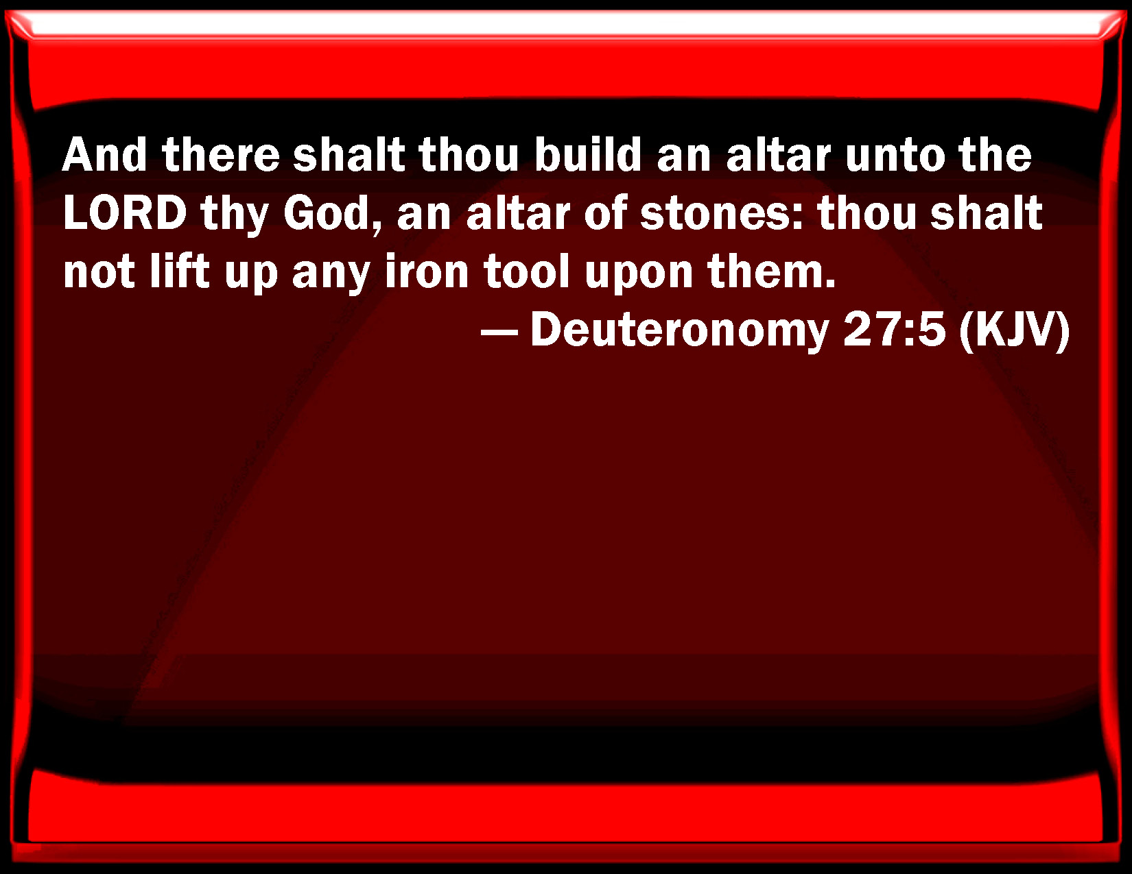 Bible Verse Slide Deuteronomy 27:5 And there shall you build an altar to the LORD your God, an altar of stones: you shall not lift up any iron tool on them. KJV: And there shalt thou build an altar unto the LORD thy God, an altar of stones: thou shalt not lift up any iron tool upon them. DRB: And thou shalt build there an altar to the Lord thy God, of stones which iron hath not touched, DBT: And there shalt thou build an altar to Jehovah thy God, an altar of stones; thou shalt not lift up an iron tool upon them; ERV: And there shalt thou build an altar unto the LORD thy God, an altar of stones: thou shalt lift up no iron tool upon them. WBT: And there shalt thou build an altar to the LORD thy God, an altar of stones: thou shalt not lift up any iron tool upon them. WEB: There you shall build an altar to Yahweh your God, an altar of stones: you shall lift up no iron [tool] on them. YLT: and built there an altar to Jehovah thy God, an altar of stones, thou dost not wave over them iron.Links Deuteronomy 27:5 NIV • Deuteronomy 27:5 NLT • Deuteronomy 27:5 ESV • Deuteronomy 27:5 NASB • Deuteronomy 27:5 KJV • Deuteronomy 27:5 Interlinear • Deuteronomy 27:5 Commentaries • Deuteronomy 27:5 Parallel Texts • Deuteronomy 27:5 Bible Apps • Deuteronomy 27:5 Parallel • Bible Hub |