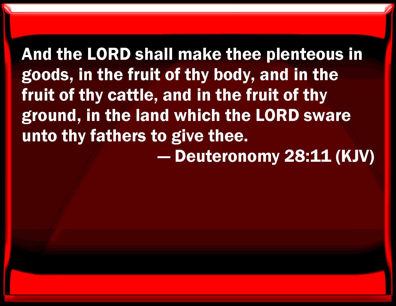 Bible Verse Slide Deuteronomy 28:11 And the LORD shall make you plenteous in goods, in the fruit of your body, and in the fruit of your cattle, and in the fruit of your ground, in the land which the LORD swore to your fathers to give you. KJV: And the LORD shall make thee plenteous in goods, in the fruit of thy body, and in the fruit of thy cattle, and in the fruit of thy ground, in the land which the LORD sware unto thy fathers to give thee. DRB: The Lord will make thee abound with all goods, with the fruit of thy womb, and the fruit of thy cattle, with the fruit of thy land, which the Lord swore to thy fathers that he would give thee. DBT: And Jehovah will give thee abundance of good, in the fruit of thy body, and in the fruit of thy cattle, and in the fruit of thy ground, in the land that Jehovah swore unto thy fathers to give thee. ERV: And the LORD shall make thee plenteous for good, in the fruit of thy body, and in the fruit of thy cattle, and in the fruit of thy ground, in the land which the LORD sware unto thy fathers to give thee. WBT: And the LORD shall make thee to abound in goods, in the fruit of thy body, and in the fruit of thy cattle, and in the fruit of thy ground, in the land which the LORD swore to thy fathers to give thee. WEB: Yahweh will make you plenteous for good, in the fruit of your body, and in the fruit of your livestock, and in the fruit of your ground, in the land which Yahweh swore to your fathers to give you. YLT: 'And Jehovah hath made thee abundant in good, in the fruit of the womb, and in the fruit of thy cattle, and in the fruit of thy ground, on the ground which Jehovah hath sworn to thy fathers to give to thee.Links Deuteronomy 28:11 NIV • Deuteronomy 28:11 NLT • Deuteronomy 28:11 ESV • Deuteronomy 28:11 NASB • Deuteronomy 28:11 KJV • Deuteronomy 28:11 Interlinear • Deuteronomy 28:11 Commentaries • Deuteronomy 28:11 Parallel Texts • Deuteronomy 28:11 Bible Apps • Deuteronomy 28:11 Parallel • Bible Hub |