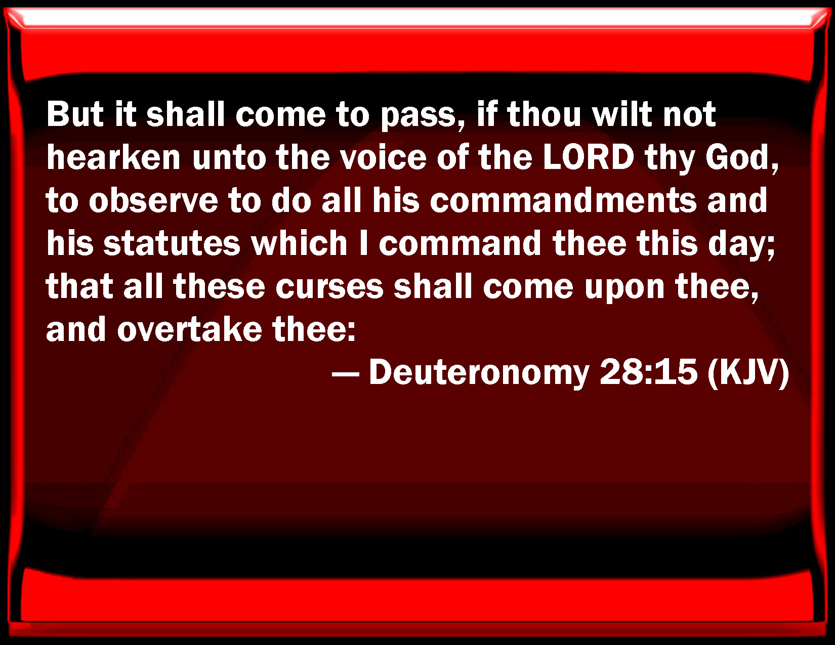 Bible Verse Slide Deuteronomy 28:15 But it shall come to pass, if you will not listen to the voice of the LORD your God, to observe to do all his commandments and his statutes which I command you this day; that all these curses shall come on you, and overtake you: KJV: But it shall come to pass, if thou wilt not hearken unto the voice of the LORD thy God, to observe to do all his commandments and his statutes which I command thee this day; that all these curses shall come upon thee, and overtake thee: DRB: But if thou wilt not hear the voice of the Lord thy God, to keep and to do all his commandments and ceremonies, which I command thee this day, all these curses shall come upon thee, and overtake thee. DBT: But it shall come to pass if thou wilt not hearken unto the voice of Jehovah thy God, to take heed to do all his commandments and his statutes which I command thee this day, that all these curses shall come upon thee and overtake thee. ERV: But it shall come to pass, if thou wilt not hearken unto the voice of the LORD thy God, to observe to do all his commandments and his statutes which I command thee this day; that all these curses shall come upon thee, and overtake thee. WBT: But it shall come to pass, if thou wilt not hearken to the voice of the LORD thy God, to observe to do all his commandments and his statutes which I command thee this day; that all these curses shall come upon thee, and overtake thee: WEB: But it shall come to pass, if you will not listen to the voice of Yahweh your God, to observe to do all his commandments and his statutes which I command you this day, that all these curses shall come on you, and overtake you. YLT: 'And it hath been, if thou dost not hearken unto the voice of Jehovah thy God to observe to do all His commands, and His statutes, which I am commanding thee to-day, that all these revilings have come upon thee, and overtaken thee:Links Deuteronomy 28:15 NIV • Deuteronomy 28:15 NLT • Deuteronomy 28:15 ESV • Deuteronomy 28:15 NASB • Deuteronomy 28:15 KJV • Deuteronomy 28:15 Interlinear • Deuteronomy 28:15 Commentaries • Deuteronomy 28:15 Parallel Texts • Deuteronomy 28:15 Bible Apps • Deuteronomy 28:15 Parallel • Bible Hub |