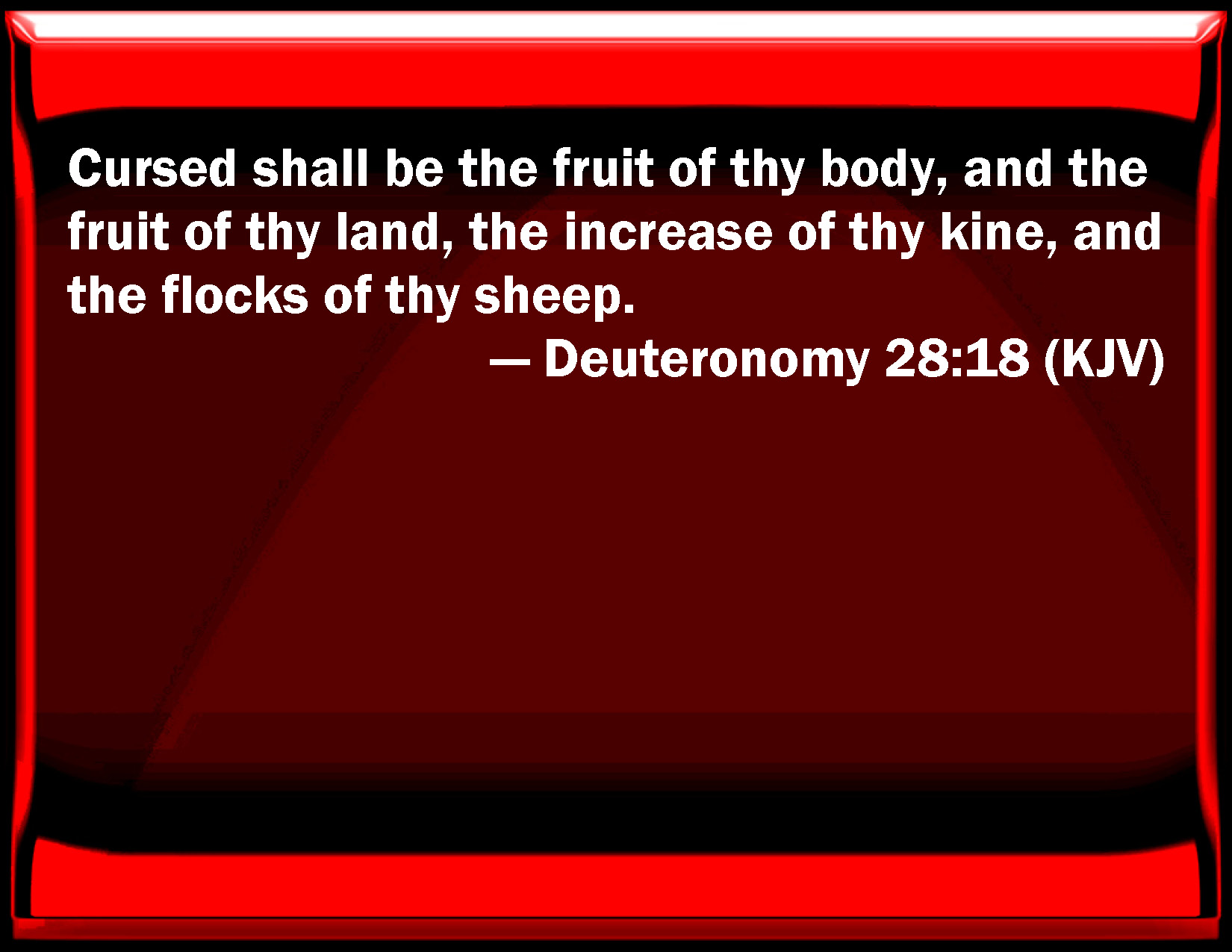 Bible Verse Slide Deuteronomy 28:18 Cursed shall be the fruit of your body, and the fruit of your land, the increase of your cows, and the flocks of your sheep. KJV: Cursed shall be the fruit of thy body, and the fruit of thy land, the increase of thy kine, and the flocks of thy sheep. DRB: Cursed shall be the fruit of thy womb, and the fruit of thy ground, the herds of thy oxen, and the flocks of thy sheep. DBT: Cursed shall be the fruit of thy womb, and the fruit of thy ground, the offspring of thy kine, and the increase of thy sheep. ERV: Cursed shall be the fruit of thy body, and the fruit of thy ground, the increase of thy kine, and the young of thy flock. WBT: Cursed shall be the fruit of thy body, and the fruit of thy land, the increase of thy kine, and the flocks of thy sheep. WEB: The fruit of your body, the fruit of your ground, the increase of your livestock, and the young of your flock shall be cursed. YLT: Cursed is the fruit of thy body, and the fruit of thy land, increase of thine oxen, and wealth of thy flock.Links Deuteronomy 28:18 NIV • Deuteronomy 28:18 NLT • Deuteronomy 28:18 ESV • Deuteronomy 28:18 NASB • Deuteronomy 28:18 KJV • Deuteronomy 28:18 Interlinear • Deuteronomy 28:18 Commentaries • Deuteronomy 28:18 Parallel Texts • Deuteronomy 28:18 Bible Apps • Deuteronomy 28:18 Parallel • Bible Hub |