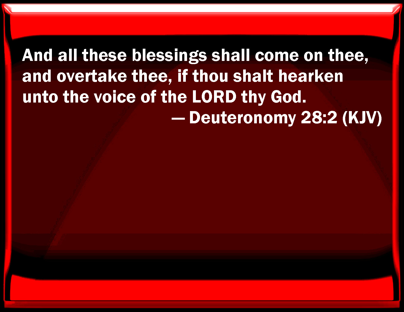 Bible Verse Slide Deuteronomy 28:2 And all these blessings shall come on you, and overtake you, if you shall listen to the voice of the LORD your God. KJV: And all these blessings shall come on thee, and overtake thee, if thou shalt hearken unto the voice of the LORD thy God. DRB: And all these blessings shall come upon thee and overtake thee: yet so if thou hear his precepts, DBT: and all these blessings shall come on thee and overtake thee, if thou shalt hearken unto the voice of Jehovah thy God. ERV: and all these blessings shall come upon thee, and overtake thee, if thou shalt hearken unto the voice of the LORD thy God. WBT: And all these blessings shall come on thee, and overtake thee, if thou shalt hearken to the voice of the LORD thy God. WEB: and all these blessings shall come on you, and overtake you, if you shall listen to the voice of Yahweh your God. YLT: and all these blessings have come upon thee, and overtaken thee, because thou dost hearken to the voice of Jehovah thy God:Links Deuteronomy 28:2 NIV • Deuteronomy 28:2 NLT • Deuteronomy 28:2 ESV • Deuteronomy 28:2 NASB • Deuteronomy 28:2 KJV • Deuteronomy 28:2 Interlinear • Deuteronomy 28:2 Commentaries • Deuteronomy 28:2 Parallel Texts • Deuteronomy 28:2 Bible Apps • Deuteronomy 28:2 Parallel • Bible Hub |