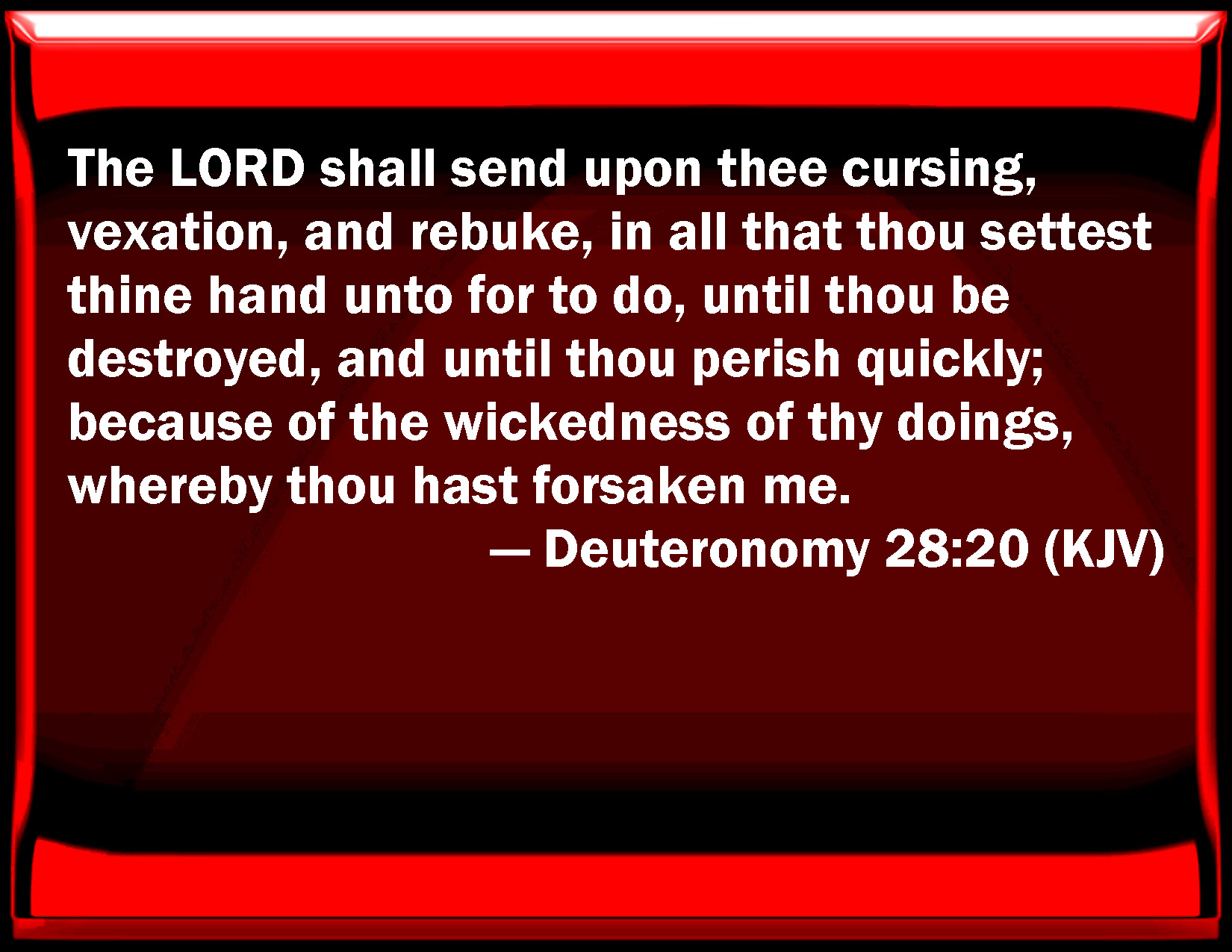 Bible Verse Slide Deuteronomy 28:20 The LORD shall send on you cursing, vexation, and rebuke, in all that you set your hand to for to do, until you be destroyed, and until you perish quickly; because of the wickedness of your doings, whereby you have forsaken me. KJV: The LORD shall send upon thee cursing, vexation, and rebuke, in all that thou settest thine hand unto for to do, until thou be destroyed, and until thou perish quickly; because of the wickedness of thy doings, whereby thou hast forsaken me. DRB: The Lord shall send upon thee famine and hunger, and a rebuke upon all the works which thou shalt do: until he consume and destroy thee quickly, for thy most wicked inventions, by which thou hast forsaken me. DBT: Jehovah will send upon thee cursing, confusion, and rebuke, in all the business of thy hand which thou doest, until thou be destroyed and until thou perish quickly, because of the wickedness of thy doings, whereby thou hast forsaken me. ERV: The LORD shall send upon thee cursing, discomfiture, and rebuke, in all that thou puttest thine hand unto for to do, until thou be destroyed, and until thou perish quickly; because of the evil of thy doings, whereby thou hast forsaken me. WBT: The LORD shall send upon thee cursing, vexation, and rebuke, in all that thou undertakest to perform, until thou shalt be destroyed, and until thou shalt perish quickly; because of the wickedness of thy doings by which thou hast forsaken me. WEB: Yahweh will send on you cursing, confusion, and rebuke, in all that you put your hand to do, until you are destroyed, and until you perish quickly; because of the evil of your doings, by which you have forsaken me. YLT: Jehovah doth send on thee the curse, the trouble, and the rebuke, in every putting forth of thy hand which thou dost, till thou art destroyed, and till thou perish hastily, because of the evil of thy doings by which thou hast forsaken Me.Links Deuteronomy 28:20 NIV • Deuteronomy 28:20 NLT • Deuteronomy 28:20 ESV • Deuteronomy 28:20 NASB • Deuteronomy 28:20 KJV • Deuteronomy 28:20 Interlinear • Deuteronomy 28:20 Commentaries • Deuteronomy 28:20 Parallel Texts • Deuteronomy 28:20 Bible Apps • Deuteronomy 28:20 Parallel • Bible Hub |