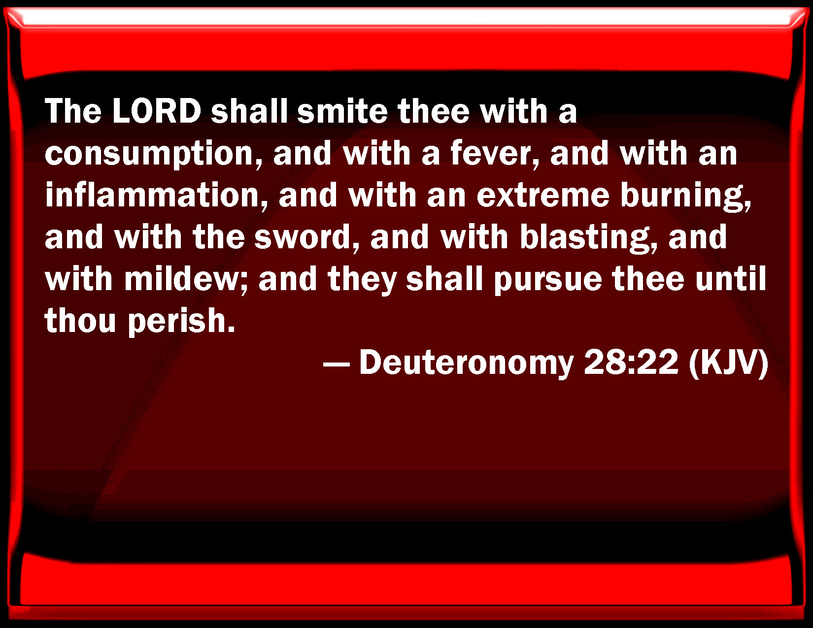 Bible Verse Slide Deuteronomy 28:22 The LORD shall smite you with a consumption, and with a fever, and with an inflammation, and with an extreme burning, and with the sword, and with blasting, and with mildew; and they shall pursue you until you perish. KJV: The LORD shall smite thee with a consumption, and with a fever, and with an inflammation, and with an extreme burning, and with the sword, and with blasting, and with mildew; and they shall pursue thee until thou perish. DRB: May the Lord afflict thee with miser- able want, with the fever and with cold, with burning and with heat, and with corrupted air and with blasting, and pursue thee till thou perish. DBT: Jehovah will smite thee with consumption, and with fever, and with inflammation, and with burning ague, and with drought, and with blight, and with mildew, and they shall pursue thee until thou perish. ERV: The LORD shall smite thee with consumption, and with fever, and with inflammation, and with fiery heat, and with the sword, and with blasting, and with mildew; and they shall pursue thee until thou perish. WBT: The LORD shall smite thee with a consumption, and with a fever, and with an inflammation, and with an extreme burning, and with the sword, and with blasting, and with mildew: and they shall pursue thee until thou dost perish. WEB: Yahweh will strike you with consumption, and with fever, and with inflammation, and with fiery heat, and with the sword, and with blight, and with mildew; and they shall pursue you until you perish. YLT: 'Jehovah doth smite thee with consumption, and with fever, and with inflammation, and with extreme burning, and with sword, and with blasting, and with mildew, and they have pursued thee till thou perishLinks Deuteronomy 28:22 NIV • Deuteronomy 28:22 NLT • Deuteronomy 28:22 ESV • Deuteronomy 28:22 NASB • Deuteronomy 28:22 KJV • Deuteronomy 28:22 Interlinear • Deuteronomy 28:22 Commentaries • Deuteronomy 28:22 Parallel Texts • Deuteronomy 28:22 Bible Apps • Deuteronomy 28:22 Parallel • Bible Hub |