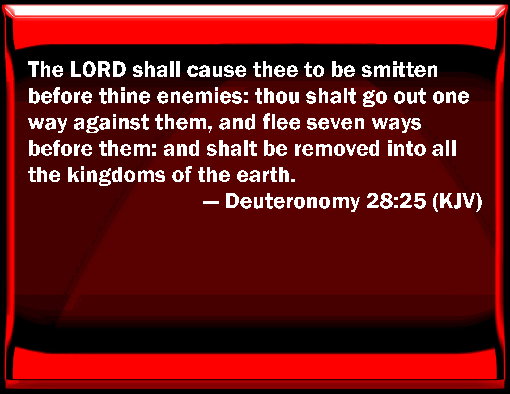 Bible Verse Slide Deuteronomy 28:25 The LORD shall cause you to be smitten before your enemies: you shall go out one way against them, and flee seven ways before them: and shall be removed into all the kingdoms of the earth. KJV: The LORD shall cause thee to be smitten before thine enemies: thou shalt go out one way against them, and flee seven ways before them: and shalt be removed into all the kingdoms of the earth. DRB: The Lord make thee to fall down before thy enemies, one way mayst thou go out against them, and flee seven ways, and be scattered throughout all the kingdoms of the earth. DBT: Jehovah will give thee up smitten before thine enemies; thou shalt go out against them one way, and by seven ways shalt thou flee before them; and thou shalt be driven hither and thither into all the kingdoms of the earth. ERV: The LORD shall cause thee to be smitten before thine enemies: thou shalt go out one way against them, and shalt flee seven ways before them: and thou shalt be tossed to and fro among all the kingdoms of the earth. WBT: The LORD shall cause thee to be smitten before thy enemies: thou shalt go out one way against them, and flee seven ways before them; and shalt be removed into all the kingdoms of the earth. WEB: Yahweh will cause you to be struck before your enemies; you shall go out one way against them, and shall flee seven ways before them: and you shall be tossed back and forth among all the kingdoms of the earth. YLT: 'Jehovah giveth thee smitten before thine enemies; in one way thou goest out unto them, and in seven ways dost flee before them, and thou hast been for a trembling to all kingdoms of the earth;Links Deuteronomy 28:25 NIV • Deuteronomy 28:25 NLT • Deuteronomy 28:25 ESV • Deuteronomy 28:25 NASB • Deuteronomy 28:25 KJV • Deuteronomy 28:25 Interlinear • Deuteronomy 28:25 Commentaries • Deuteronomy 28:25 Parallel Texts • Deuteronomy 28:25 Bible Apps • Deuteronomy 28:25 Parallel • Bible Hub |